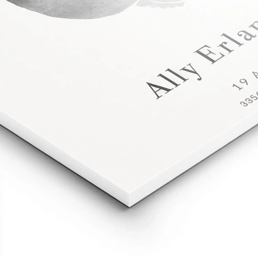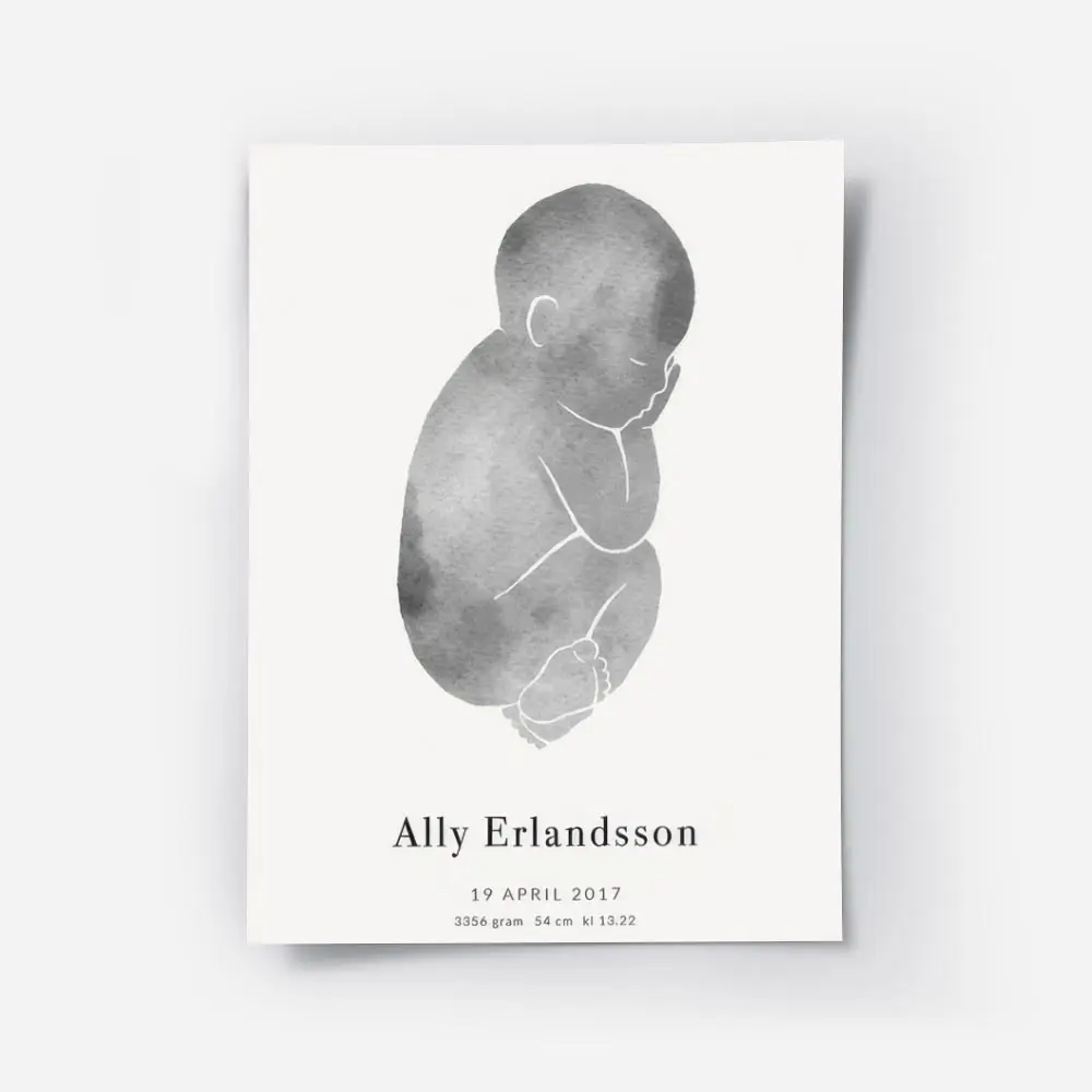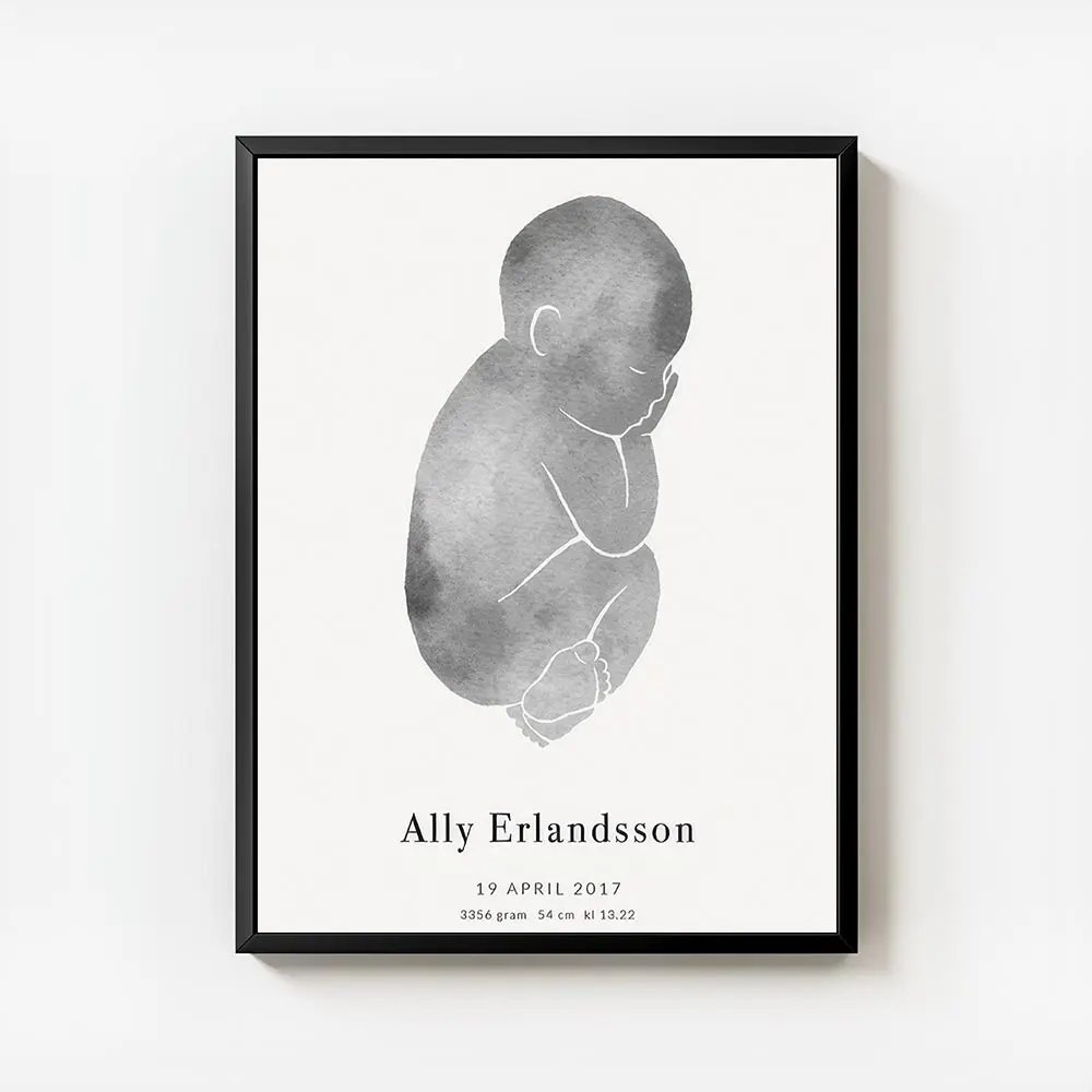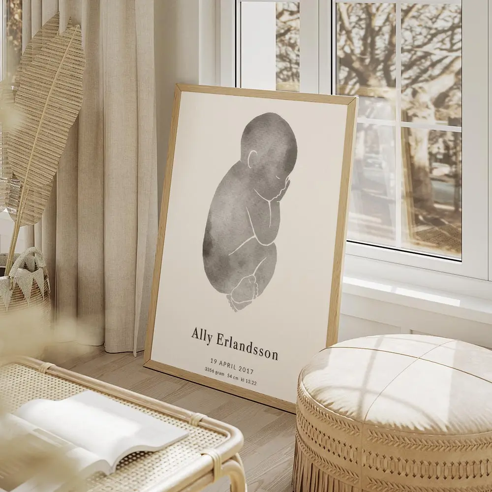 Cette Affiche bébé gris personnalisé apporte une présence douce et discrète. On voit une silhouette de bébé gris, posée sur un fond clair. Un texte personnalisable apparaît en typographie épurée, centré sous le dessin, simple et très lisible. Simple, très simple. Les nuances de gris restent douces et la composition respire, il y a beaucoup d’espace autour, calme et aéré.