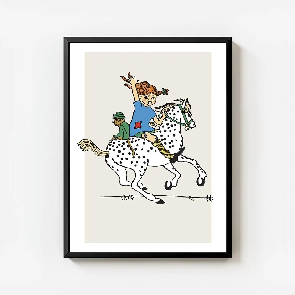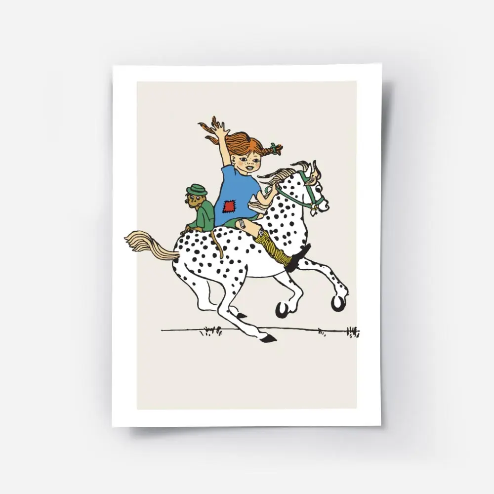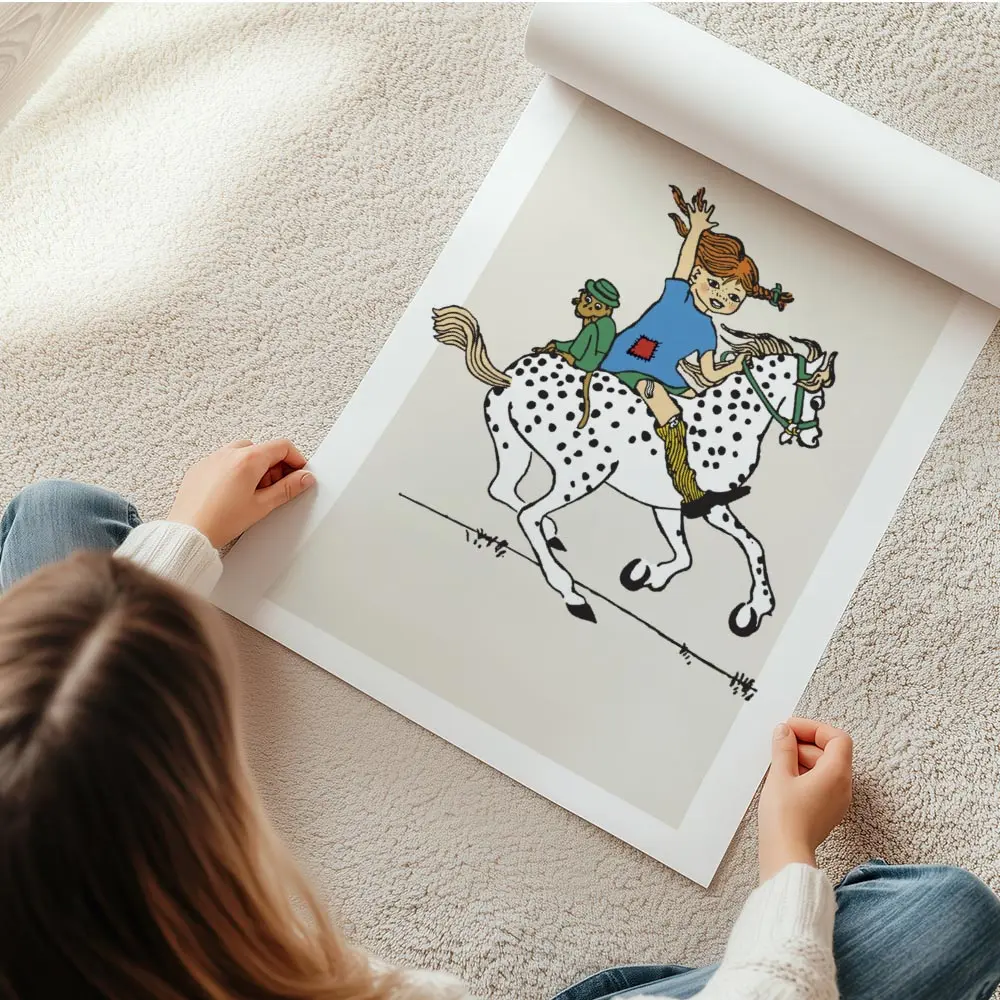 Cette Affiche Fifi Brindacier à cheval montre une scène pleine d’énergie: une fillette aux tresses rousses assise sur un cheval brun, le cheval vu de profil, et un fond bleu clair qui ouvre l’espace. On voit le visage souriant, les yeux vifs, et la posture dynamique, bien droite, prête à galoper.