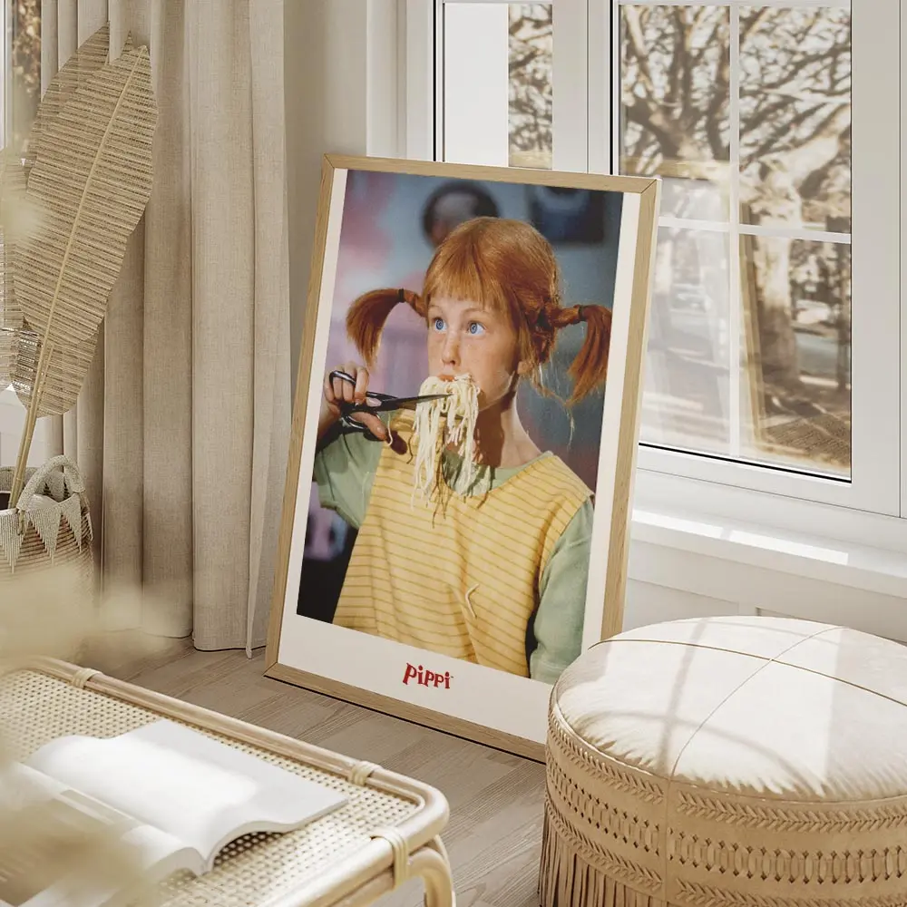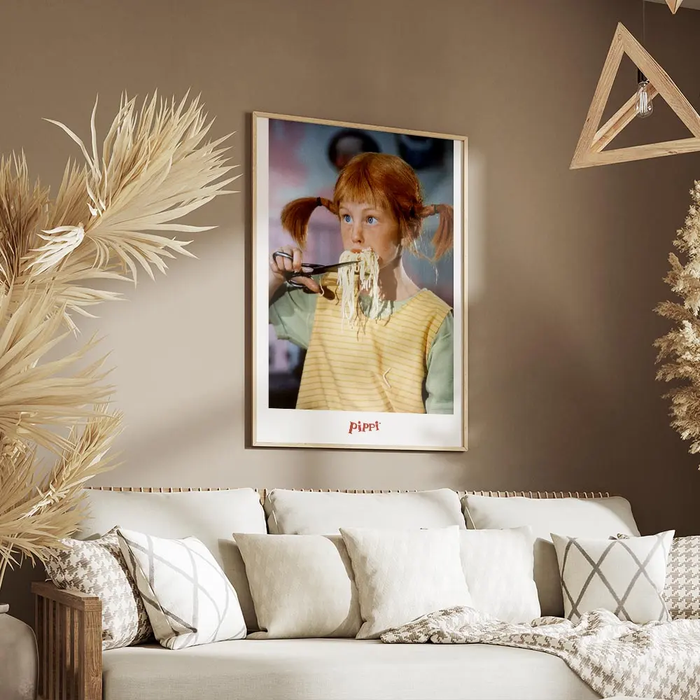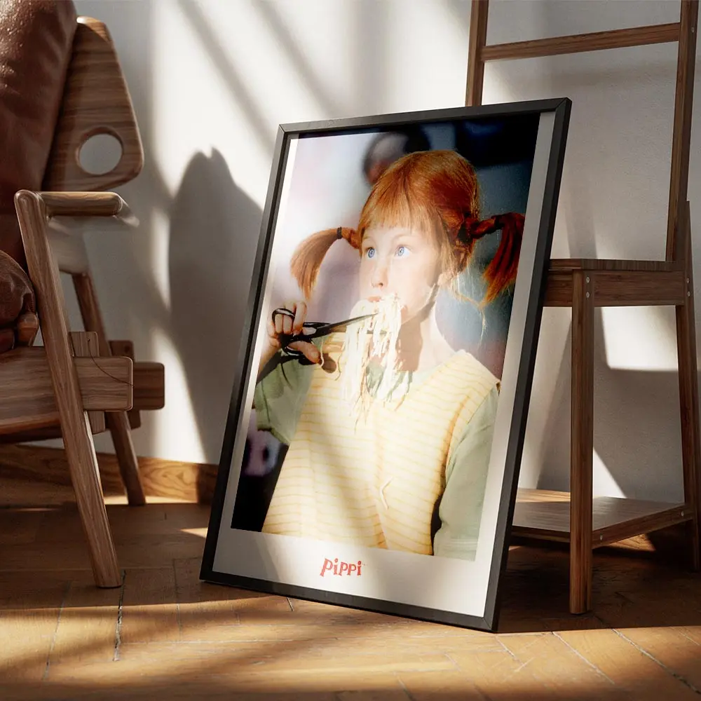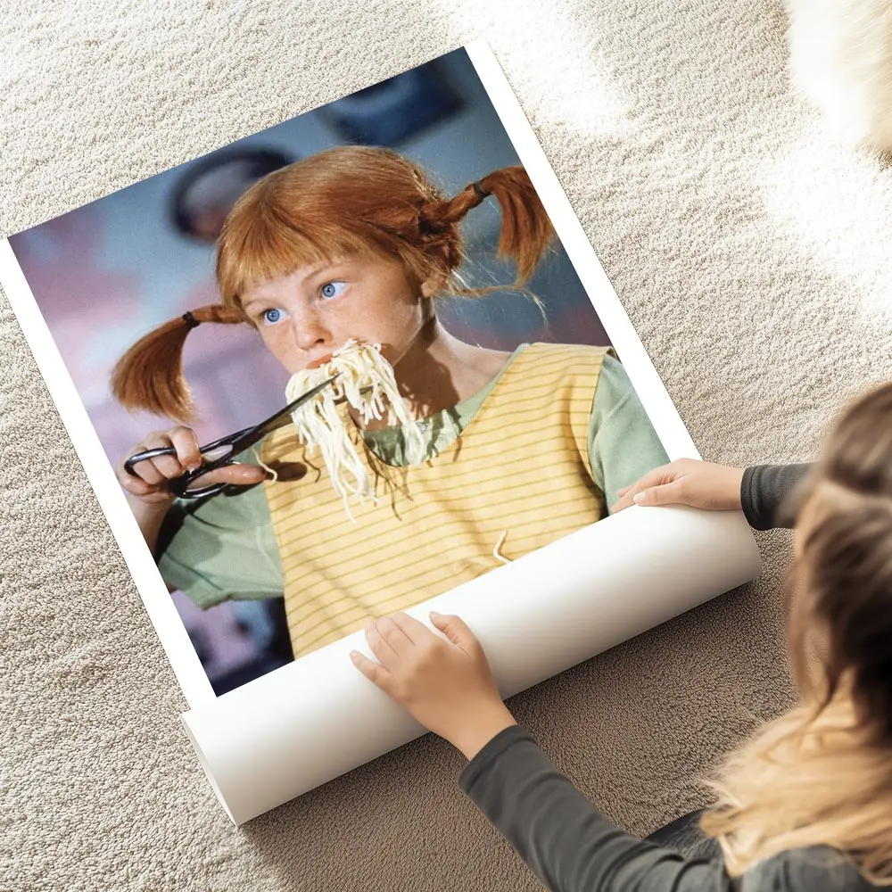 L’Affiche Fifi Brindacier mangeant des spaghetti montre une fillette aux tresses rousses qui croque une longue portion de spaghetti multicolores. On voit clairement des ciseaux tenus près de la bouche, des brins de pâtes qui tombent, et des traits de dessin nets qui donnent du mouvement. Le fond reste clair, simple, pour laisser le visuel respirer.