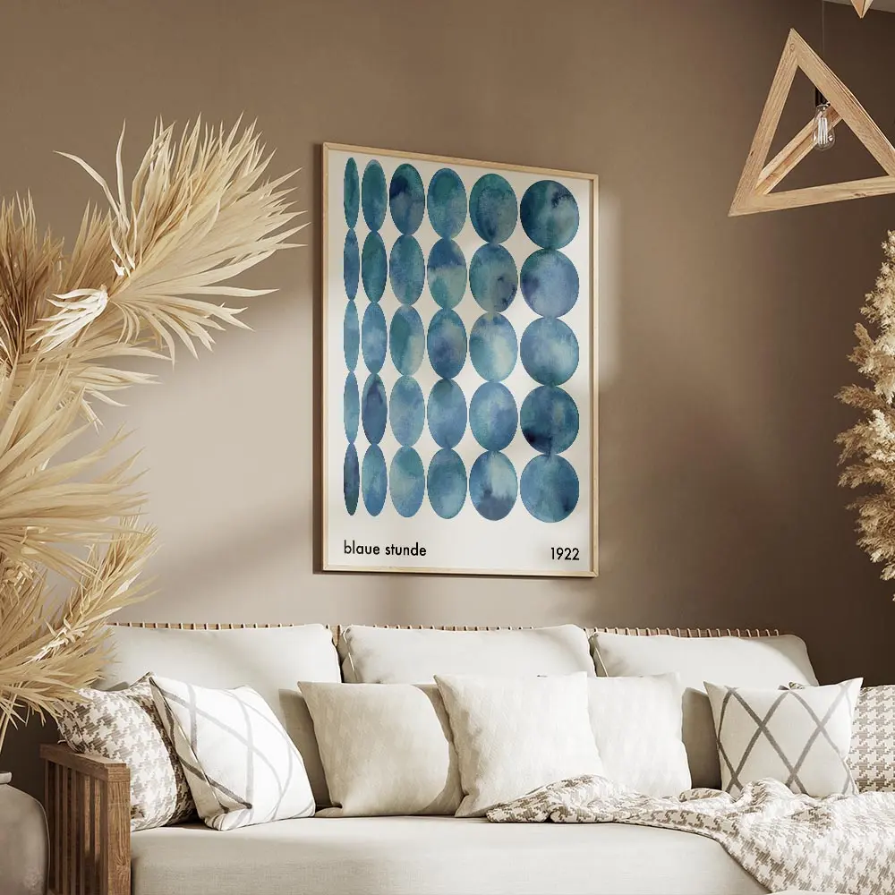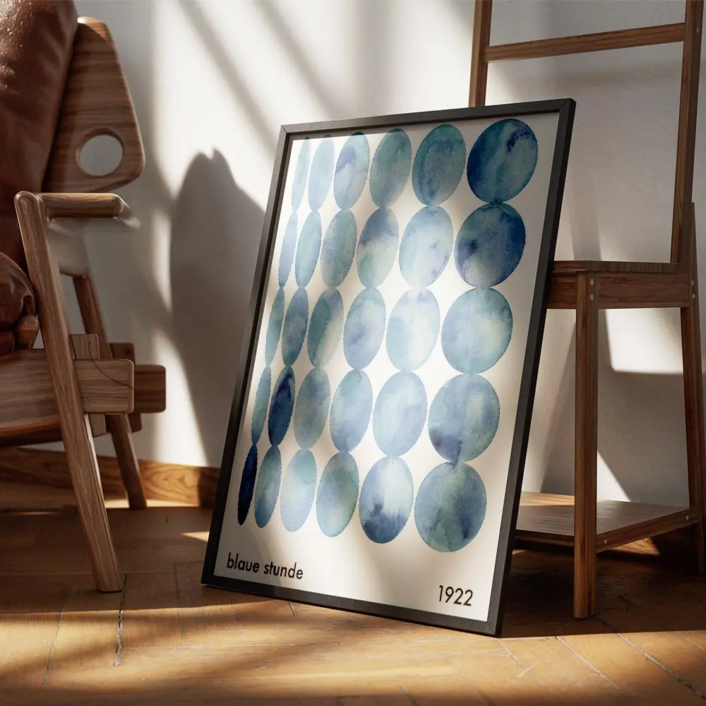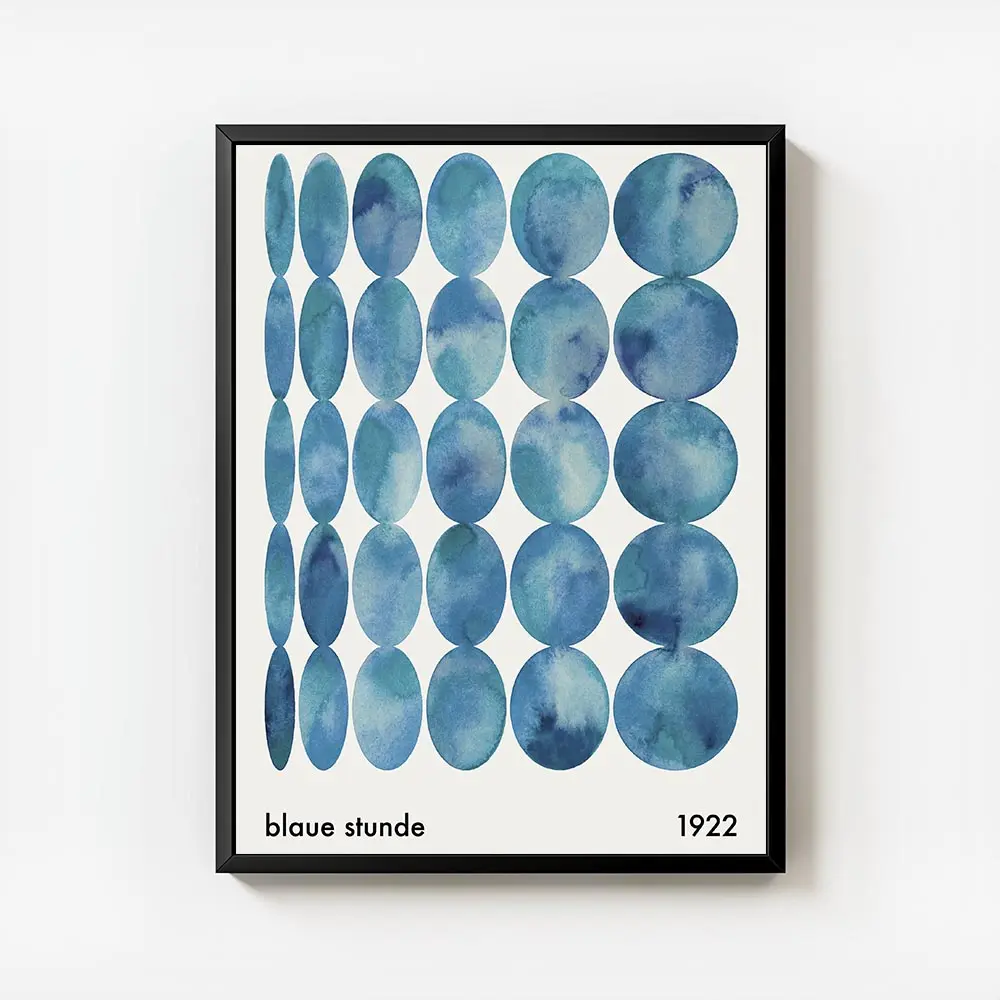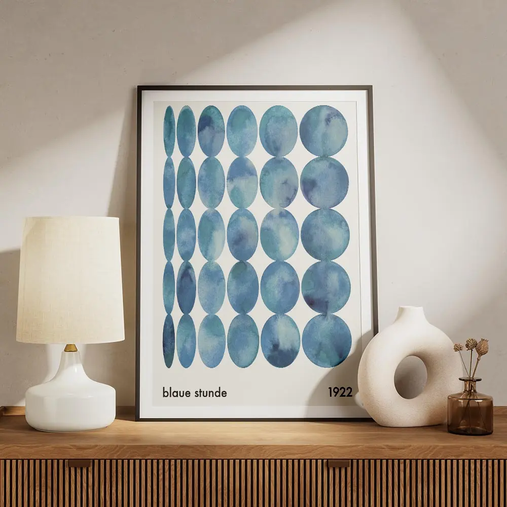 affiche dart abstrait bleu avec des cercles de formes variees et une typographie.webp