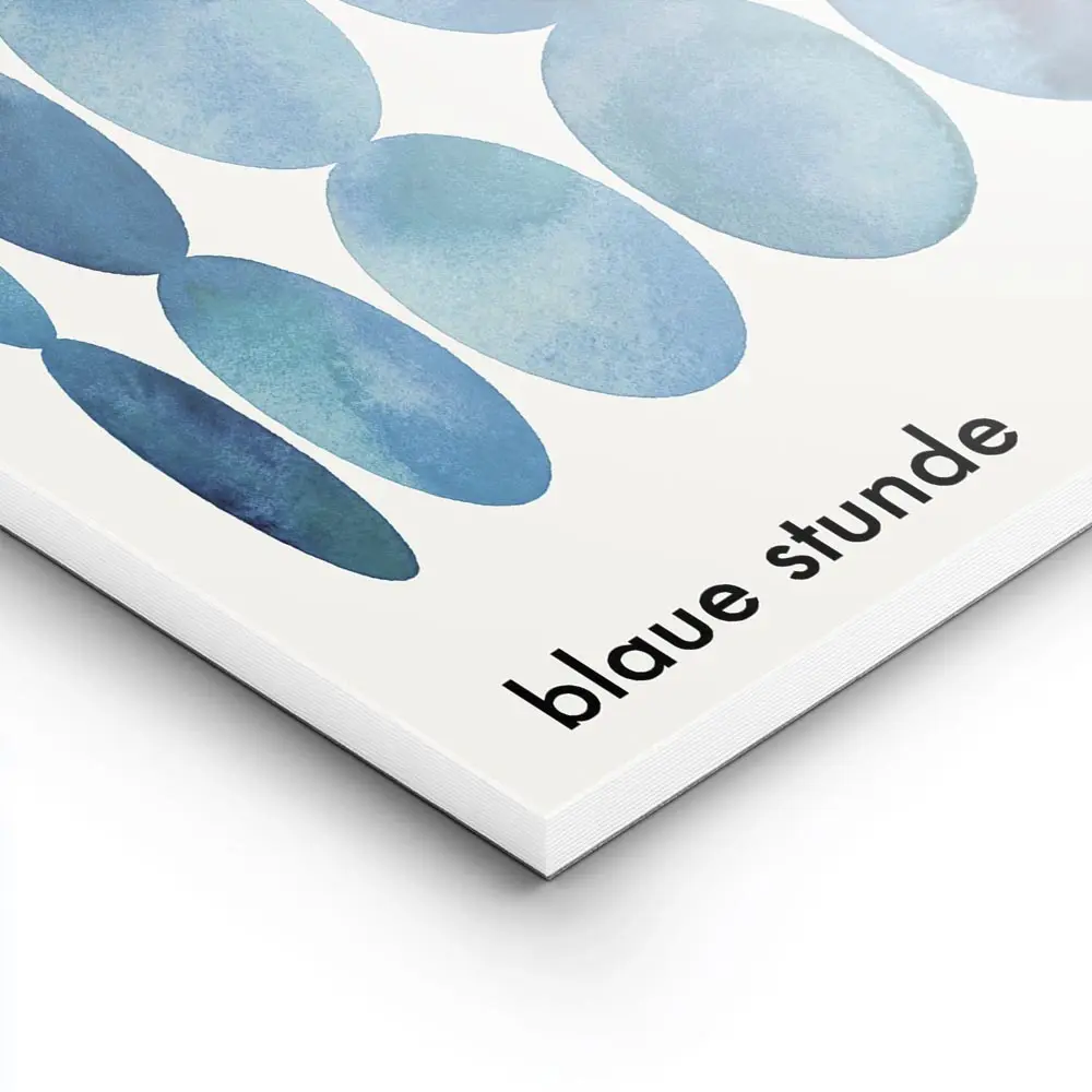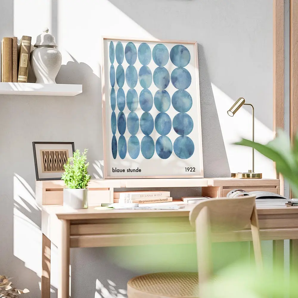 Affiche abstrait bleu à cercles joue avec le bleu, les formes et la typographie. Fond bleu, cercles de formes variées et de tailles différentes, et une typographie bien lisible donnent du rythme. On ressent un équilibre clair, simple et contemporain, un peu joueur aussi.