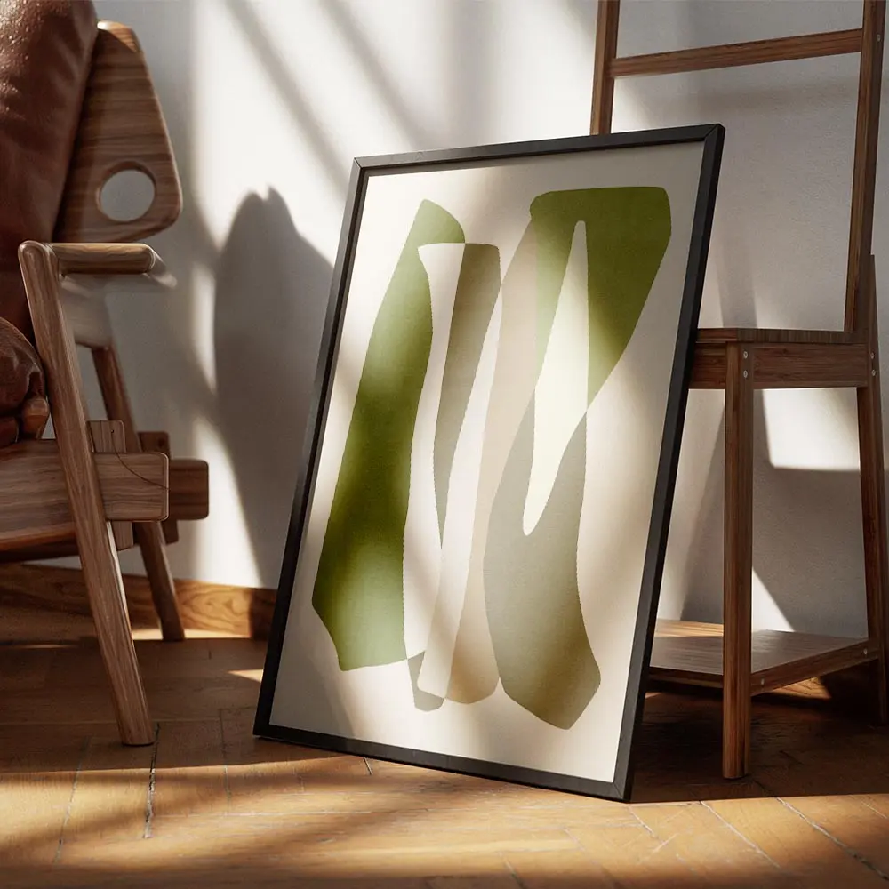 Ce Affiche formes graphiques vertes blanches marron montre des formes graphiques sur un fond beige chaud. On distingue des aplats verts, blancs, gris et marron, posés à différentes tailles. Les contours restent nets, l'espace respire, l'ensemble paraît épuré et posé. On voit des zones claires à côté de touches plus foncées, ce qui donne du relief.