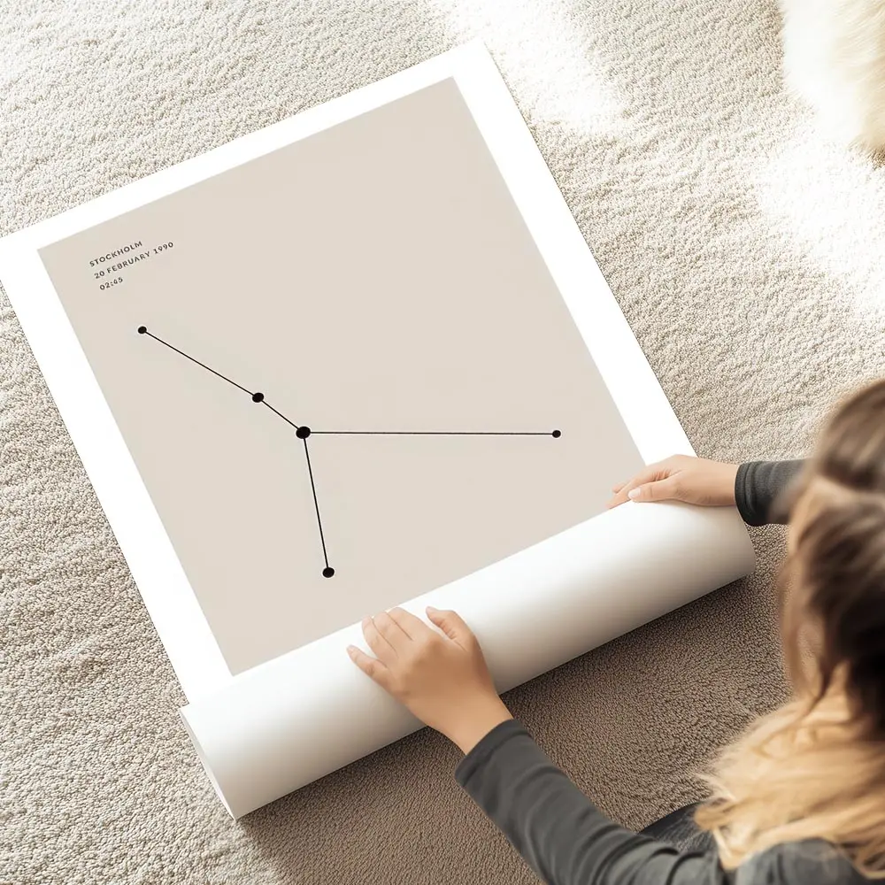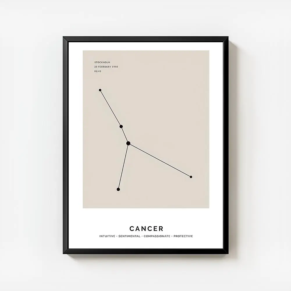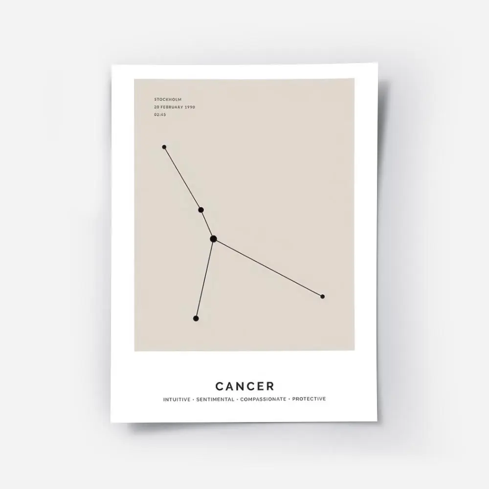 Cette Affiche astrologique Cancer constellation beige propose un visuel calme et raffiné. Le fond beige crée une ambiance douce et chaleureuse. La constellation occupe le centre, avec des points et des lignes fines qui relient les points. Une typographie sobre indique le signe sous le tracé.