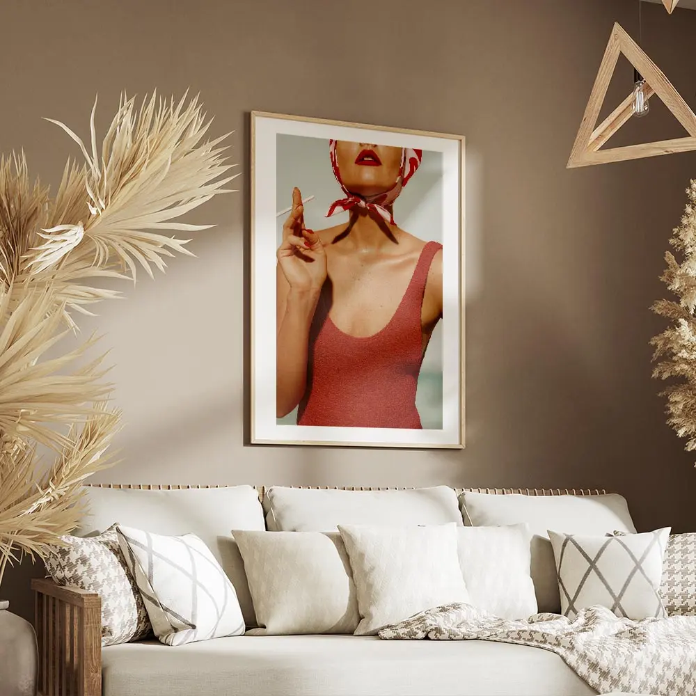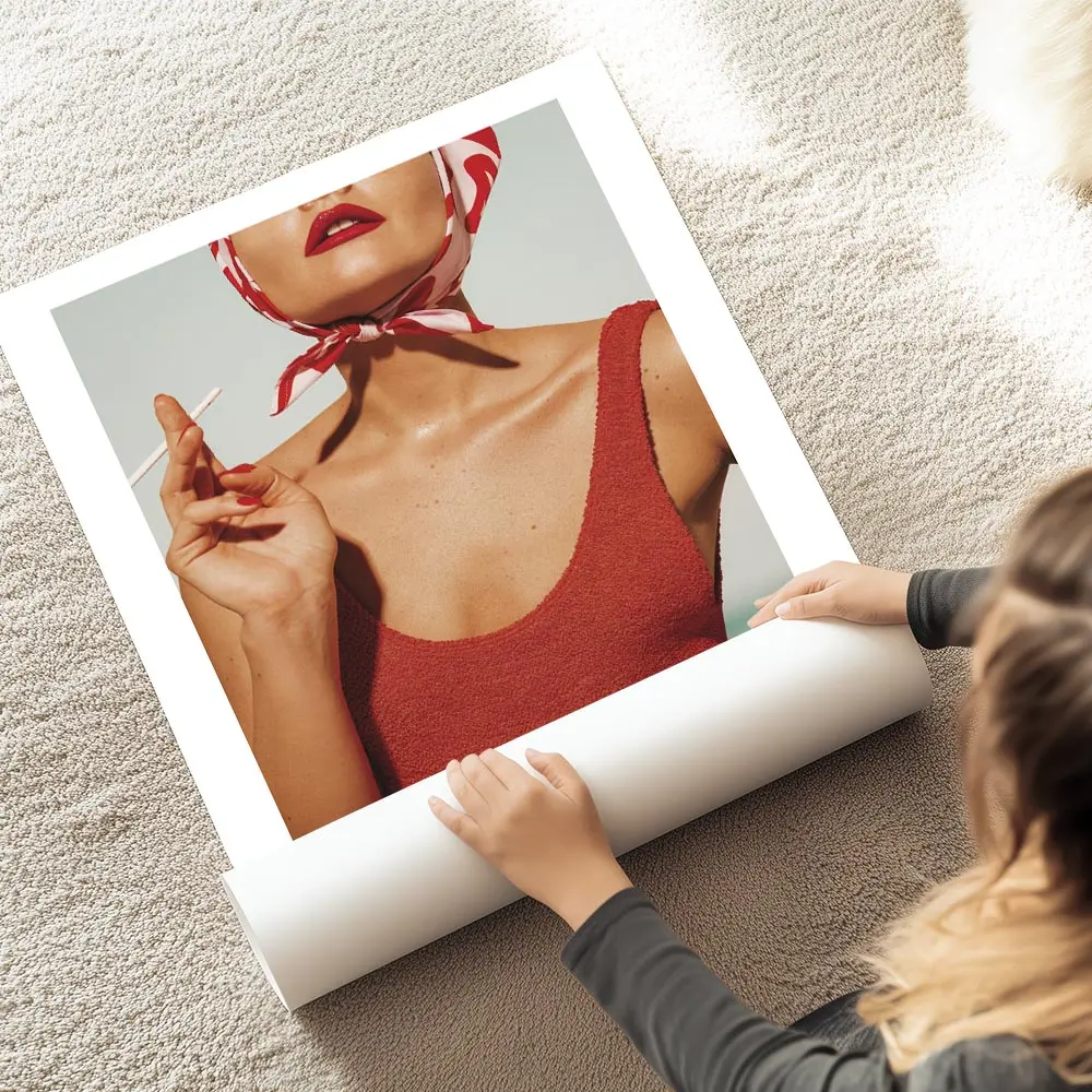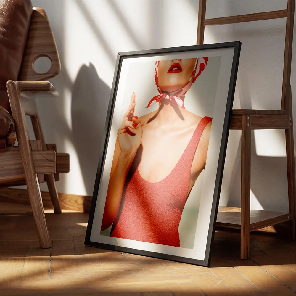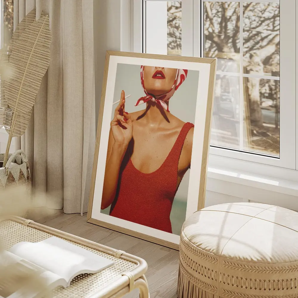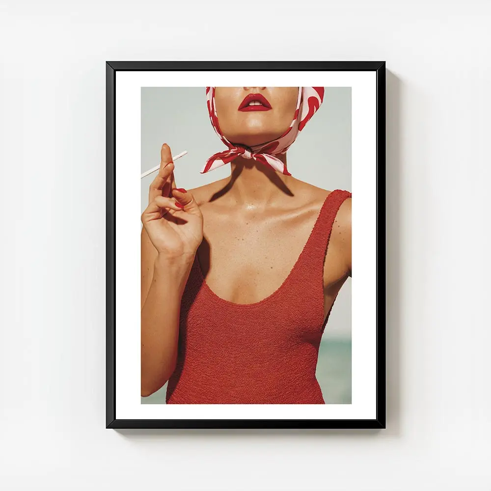 Cette Affiche Bella Donna rouge montre une femme élégante en maillot de bain rouge, avec des lèvres écarlates bien visibles. Le cadrage serre le visage et l’épaule, le regard reste franc et présent. On voit aussi une peau lumineuse, un maquillage net, et une silhouette sophistiquée.