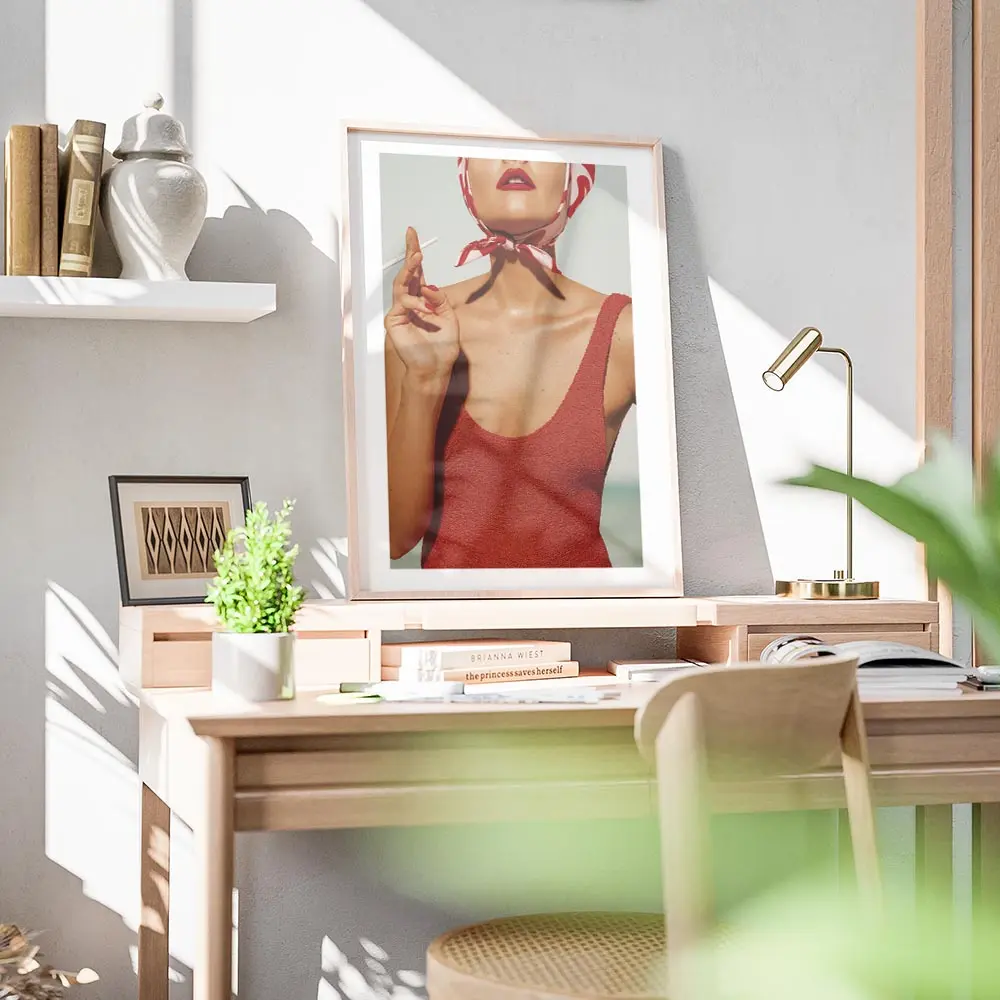 On accroche ce poster au-dessus d’une commode, d’un bureau ou dans une chambre. On l’associe à des tons neutres, beige ou blanc cassé, et à des cadres fins noirs pour souligner le contraste. Pour prolonger l’ambiance, on consulte notre sélection mode et nos portraits, comme sur mode ou portraits.