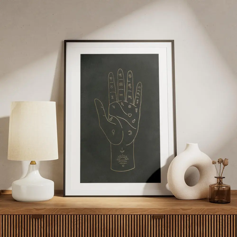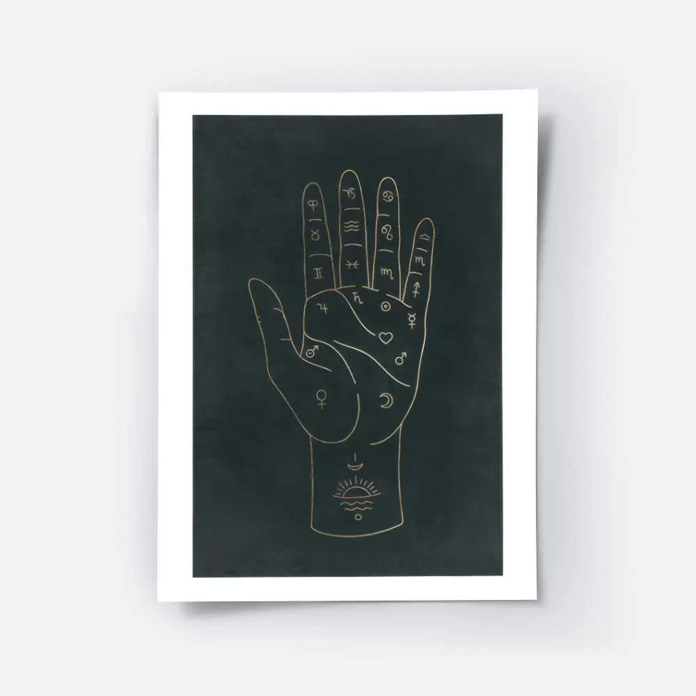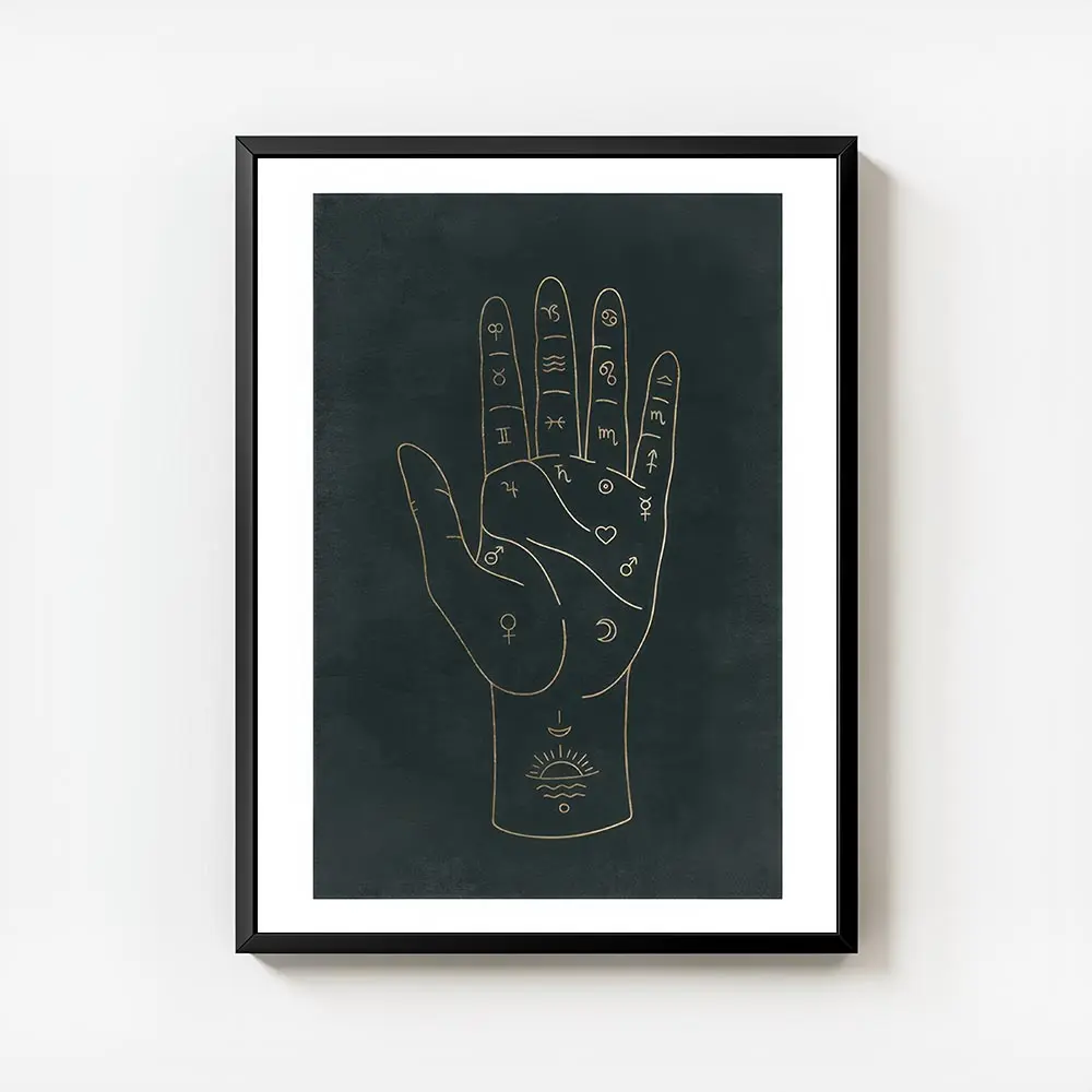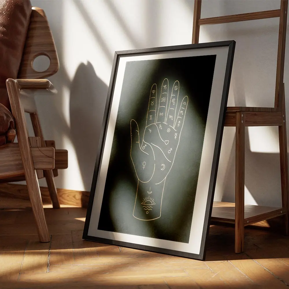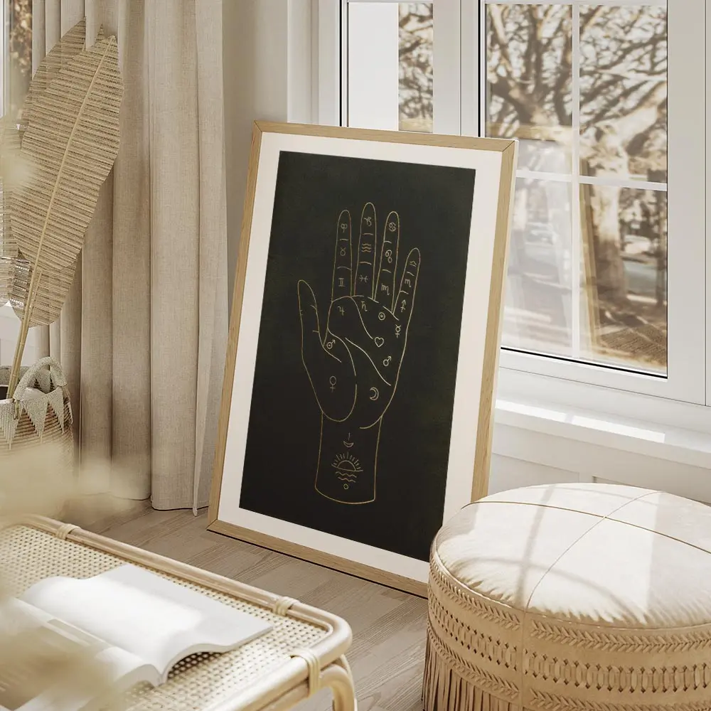 Ce Affiche chiromancie main dorée attire l'œil avec une main dorée, paume ouverte et lignes bien marquées. Autour, on voit des signes astronomiques, des petites étoiles et un croissant de lune. Le fond reste sombre, presque noir, qui fait ressortir l’or. L'ensemble donne une impression à la fois mystique et très graphique, simple et précis.