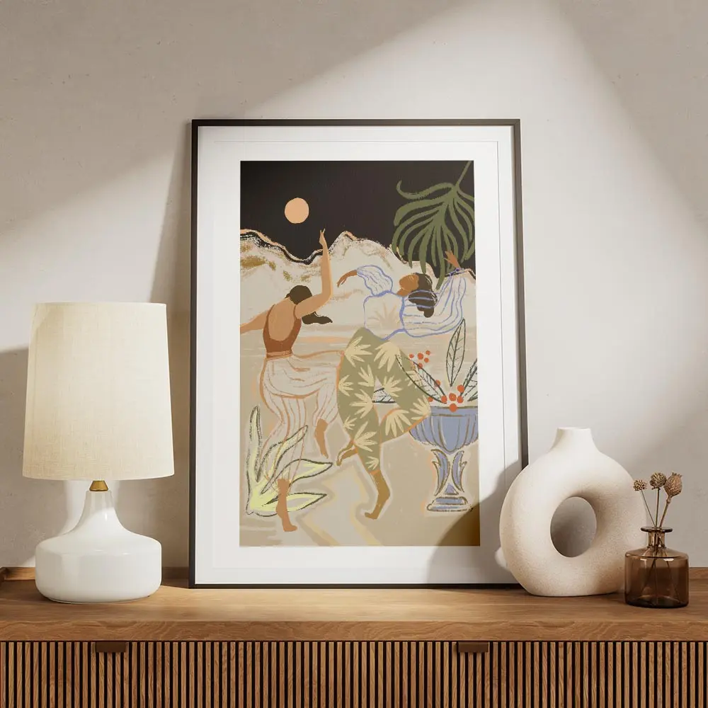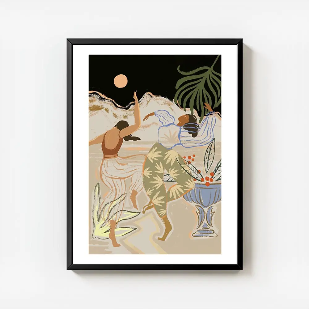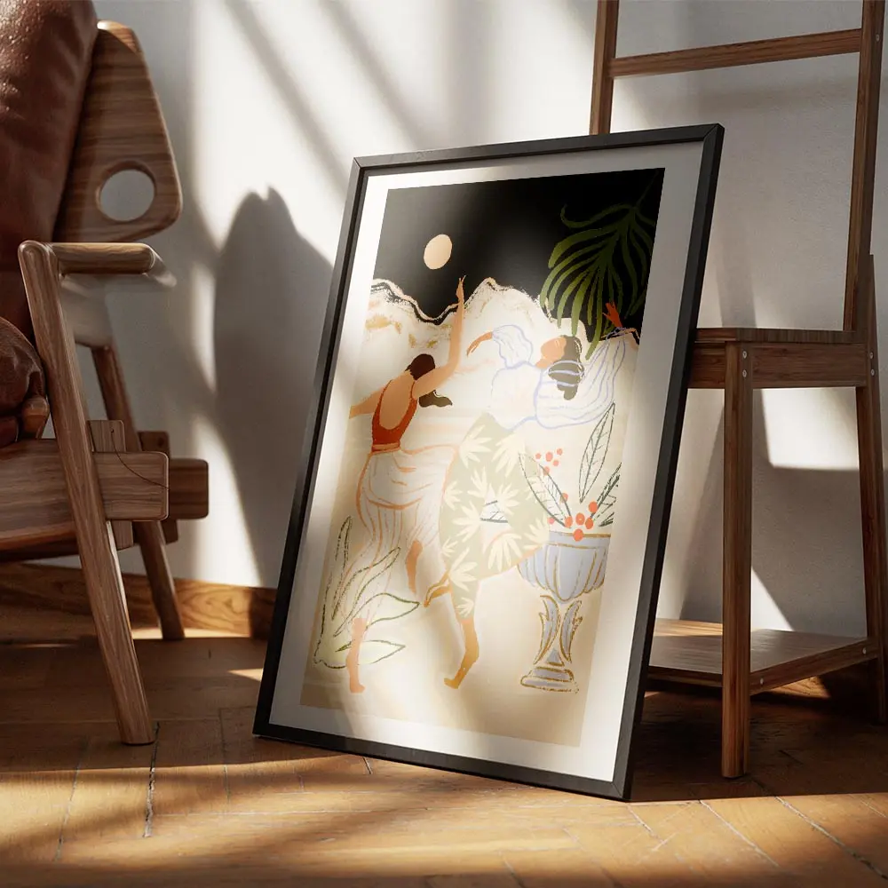 Cette Affiche deux femmes dansant sous la lune capture un moment calme et vivant à la fois. On voit deux silhouettes féminines en train de danser, des gestes fluides, des vêtements qui semblent bouger. La lune ronde éclaire la scène, elle brille contre un ciel sombre et profond. On perçoit aussi de petites étoiles ou points lumineux, et un jeu d’ombres qui crée du contraste, doux mais présent.