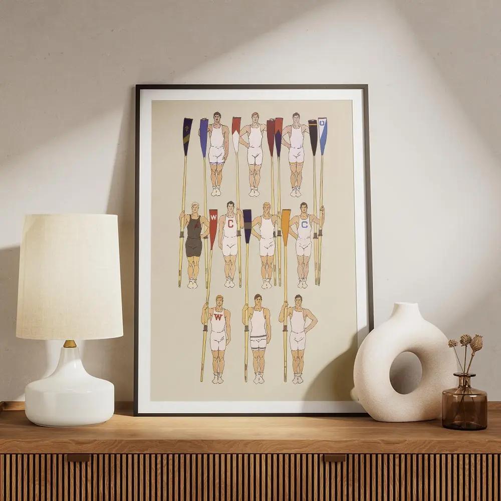 Ce Affiche dix rameurs en aviron montre dix silhouettes alignées, réparties en trois rangées bien nettes. On voit des avirons colorés qui ressortent, des rameurs vêtus d’uniformes identiques, et une composition très graphique qui joue sur la répétition. Le rendu fait penser à une scène ordonnée, presque militaire, mais légère.
