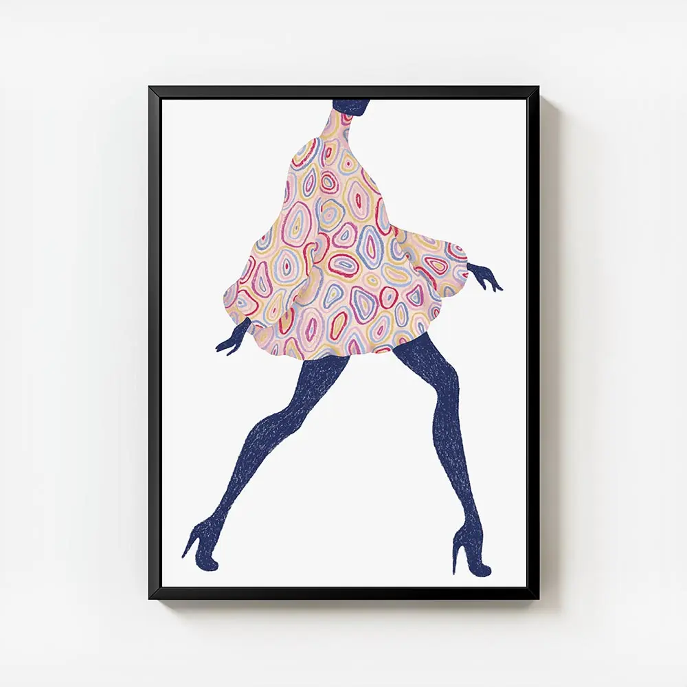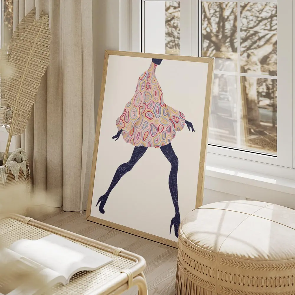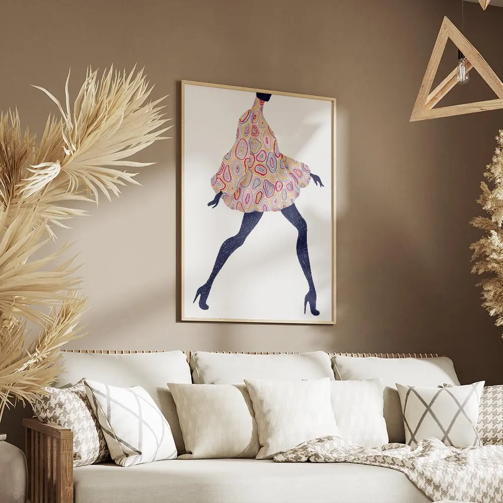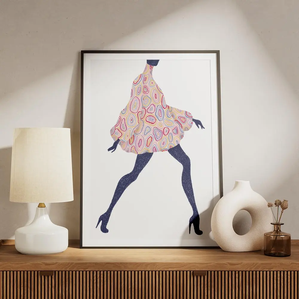 Ce Affiche femme motifs talons montre une femme en robe à motifs, en train de marcher, talons hauts bien visibles. On remarque le mouvement de la robe qui ondule autour des jambes. La palette de couleurs vives capte tout de suite l’attention, pleine d’énergie, vraiment colorée.