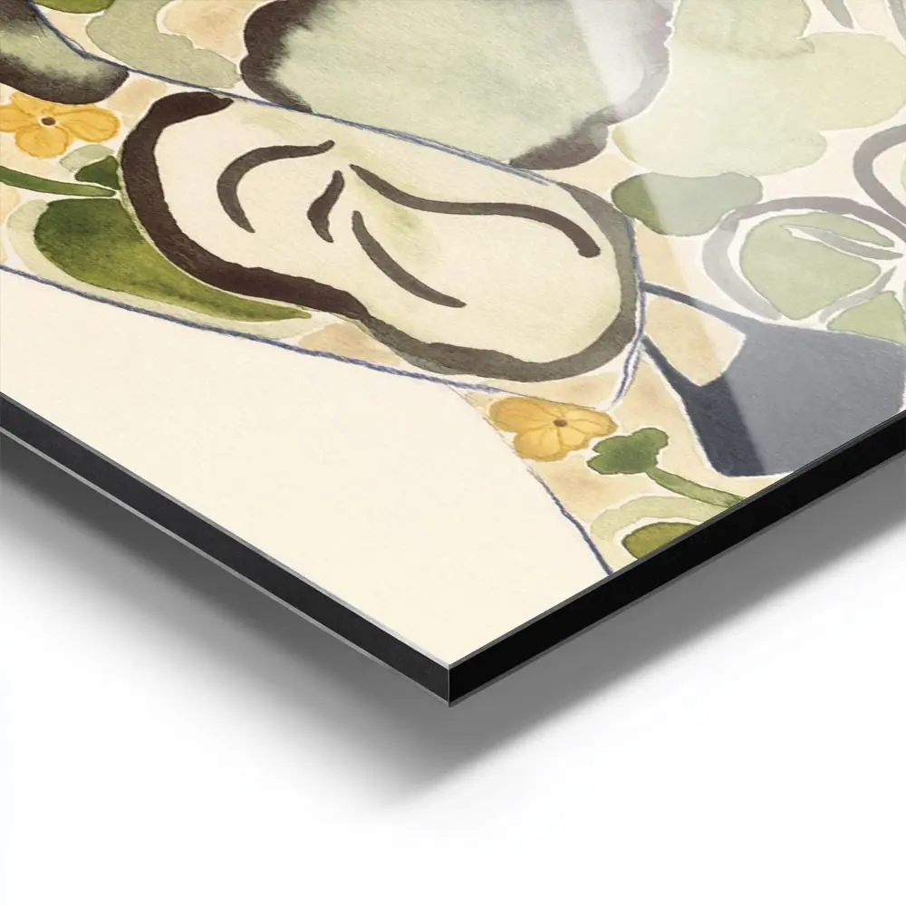 On repère les tons verts et jaunes de la robe, des fleurs dessinées qui couvrent le tissu, et quelques touches de blanc qui apportent de la lumière. Le visage se dessine de façon sobre, sans détails superflus. Les proportions et la posture créent une impression douce, presque graphique.