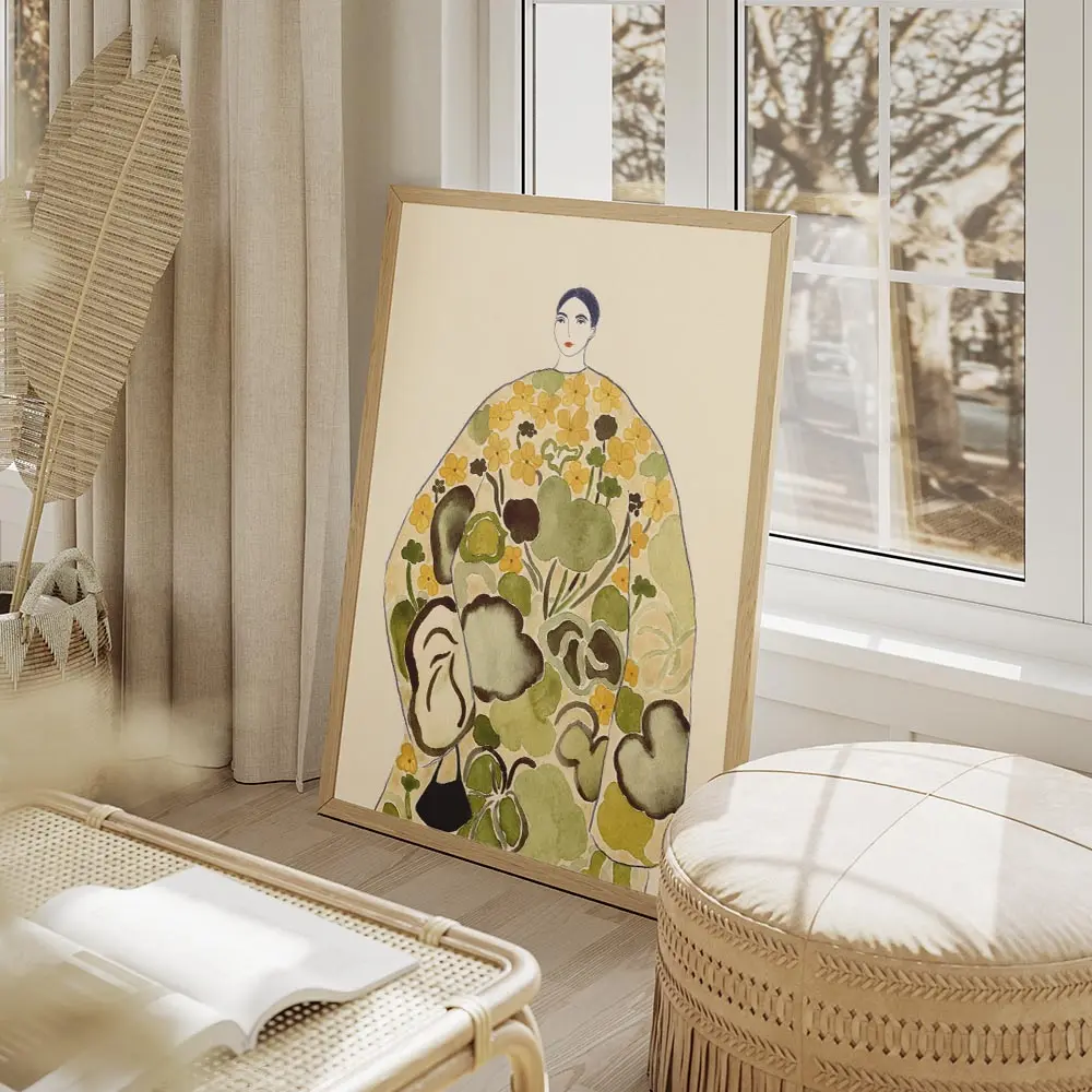Ce poster fonctionne très bien sur un mur blanc ou beige pour garder l’air calme, ou sur un mur vert pâle pour renforcer les teintes de la robe. On l’associe à des cadres fins, un vase en céramique jaune ou des plantes vertes pour jouer la continuité. Pour d’autres idées, découvrir nos posters fleurs ou parcourir nos posters affiches.