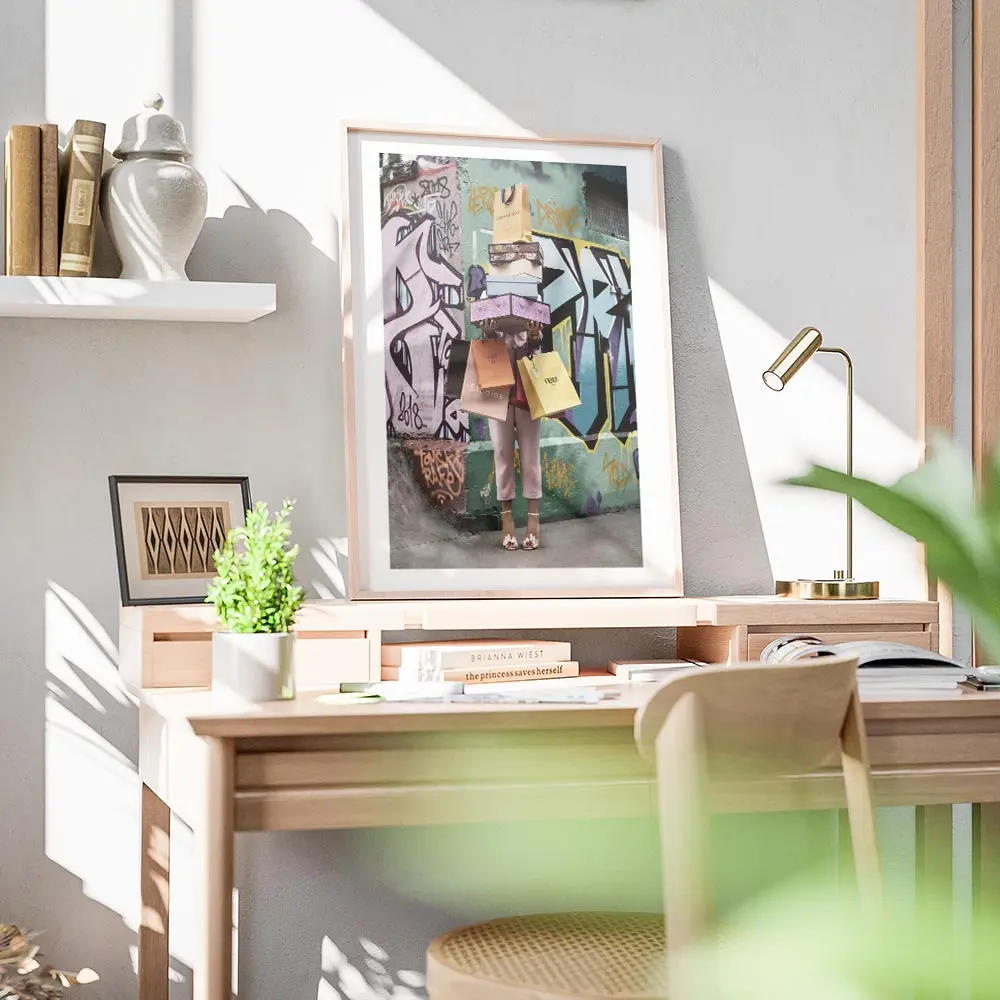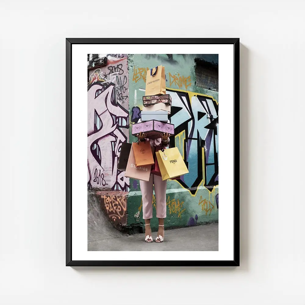 Ce Affiche femme shopping mur graffiti montre une femme debout devant un mur de graffitis stylisé. On voit plusieurs sacs et boîtes d’achats posés ou tenus à la main. Le mur apporte de la texture, des touches colorées et un esprit de rue, très urbain. L’image garde un contraste marqué entre le sujet net et le fond peint.