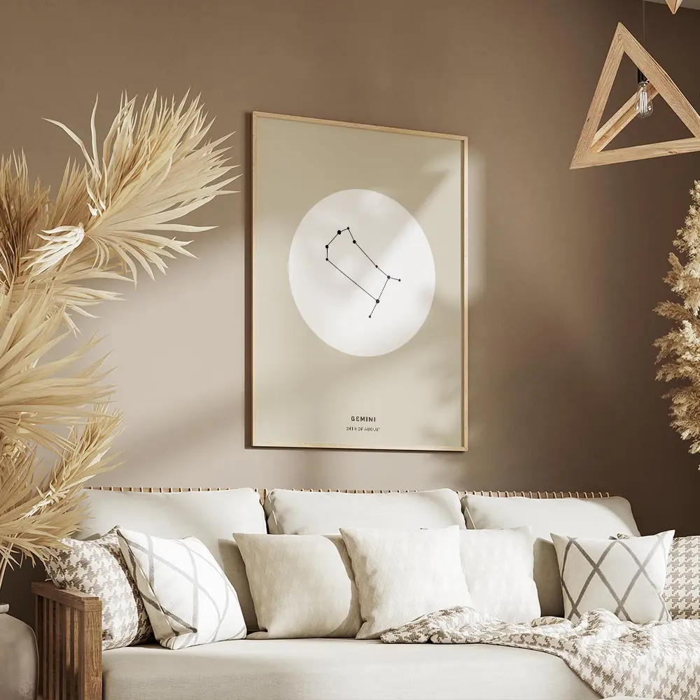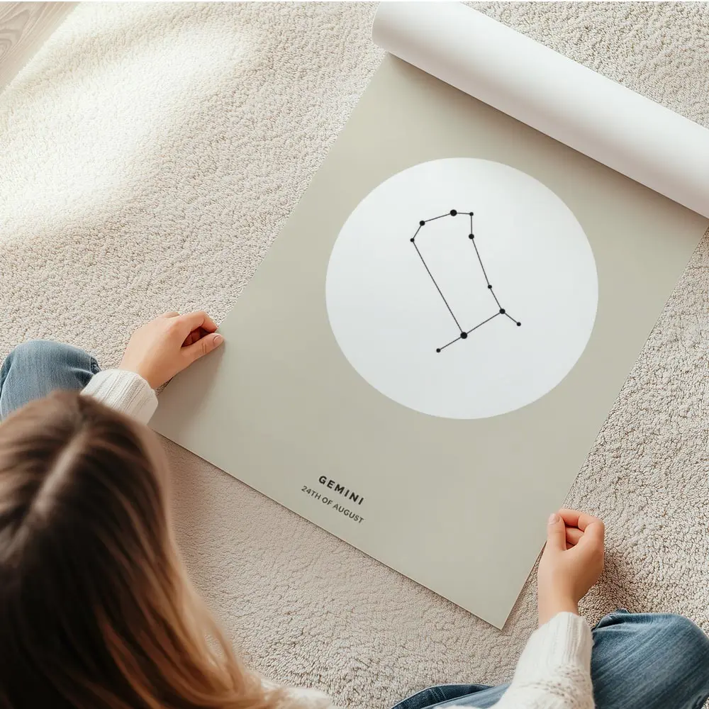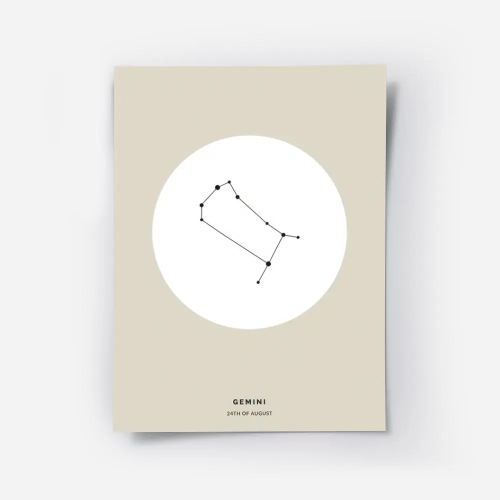 Cette affiche mise sur la simplicité et l'élégance. Un fond beige doux accueille une illustration astrologique des Gémeaux, placée au centre dans un cercle noir. Le dessin en noir présente le symbole des Gémeaux, lignes claires et composition symétrique. L'ensemble a un air calme, presque minimaliste, très graphique.