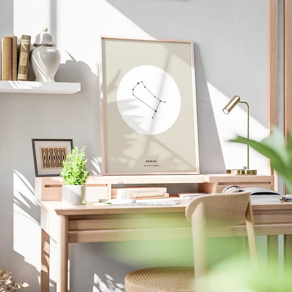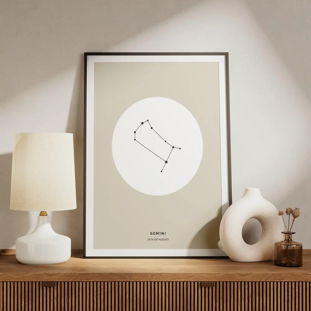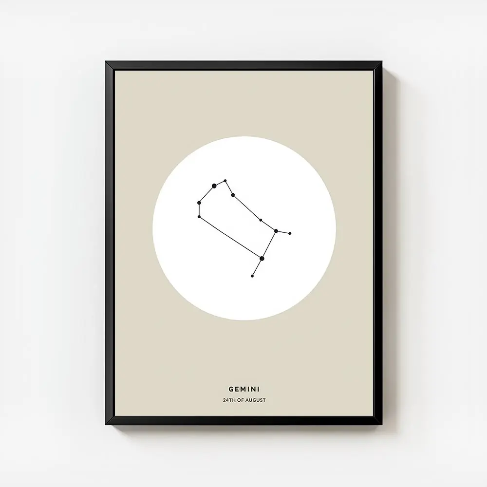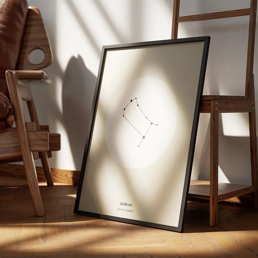 Cette affiche mise sur la simplicité et l'élégance. Un fond beige doux accueille une illustration astrologique des Gémeaux, placée au centre dans un cercle noir. Le dessin en noir présente le symbole des Gémeaux, lignes claires et composition symétrique. L'ensemble a un air calme, presque minimaliste, très graphique.