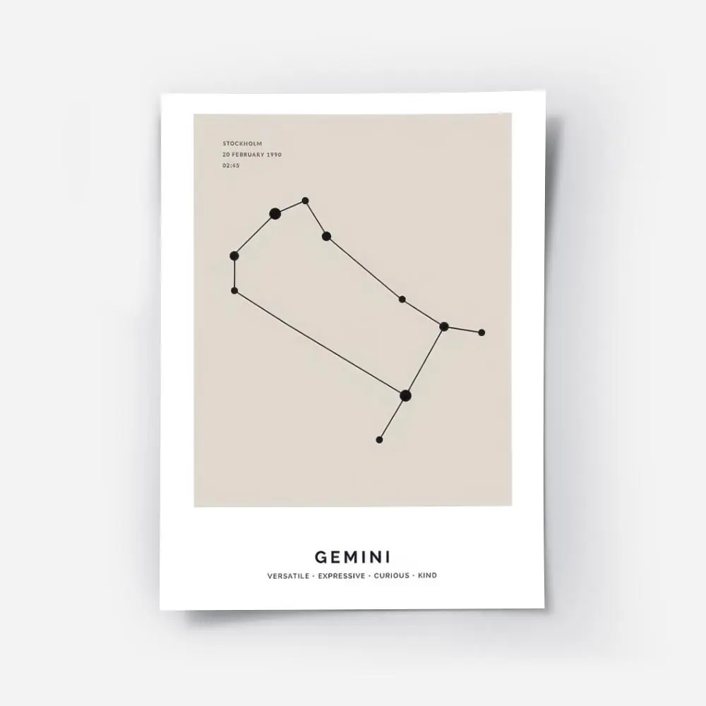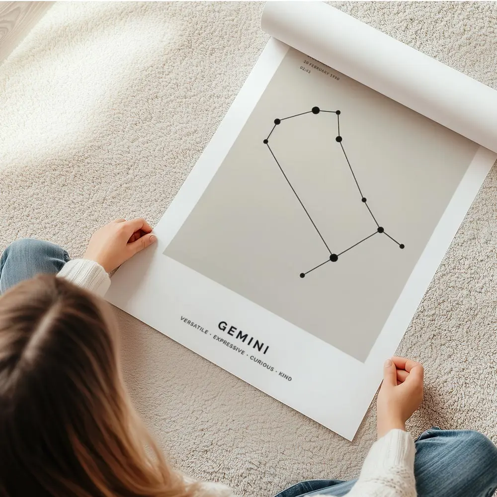Cette Affiche Gémeaux noir beige montre une constellation tracée en noir sur un fond beige doux. On voit des points étoiles noirs reliés par de fines lignes, quelques petits cercles plus marqués, et une typographie discrète qui indique le nom du signe. Le rendu reste minimaliste, graphique et assez élégant, sans artifice.