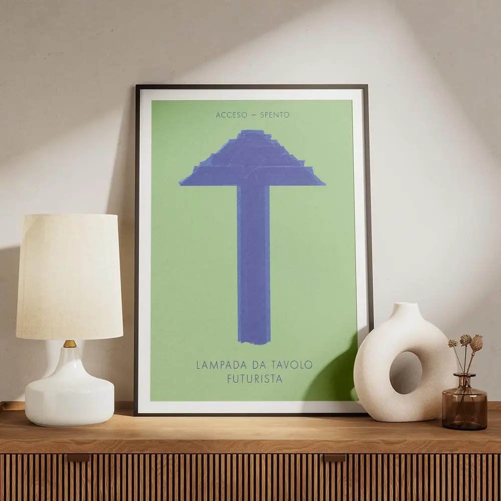 Cette affiche Affiche lampe futuriste bleue fond vert montre une lampe de table au design futuriste et simple. On voit une silhouette bleue nette, une tige fine qui monte vers un globe lumineux, et une base ronde posée avec légèreté. Le fond vert uni crée un contraste immédiat. L'atmosphère reste douce, presque rêveuse, avec une lueur bleutée autour du globe. On aime l'équilibre entre simplicité et caractère. Le rendu donne une impression rétro-futuriste, presque ludique.