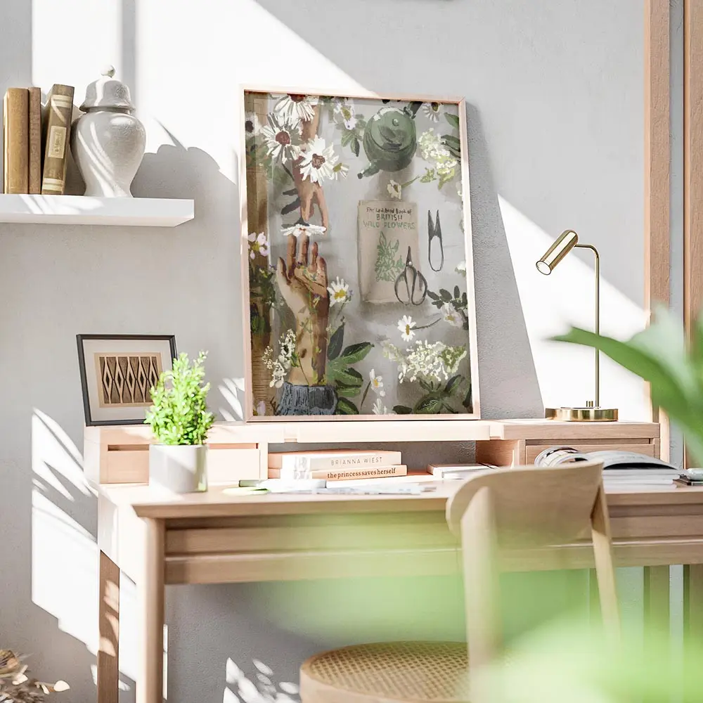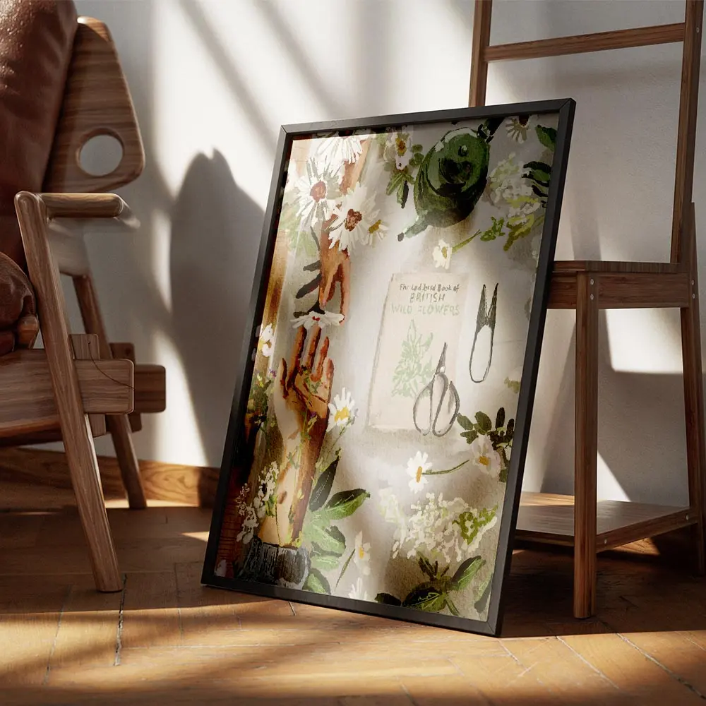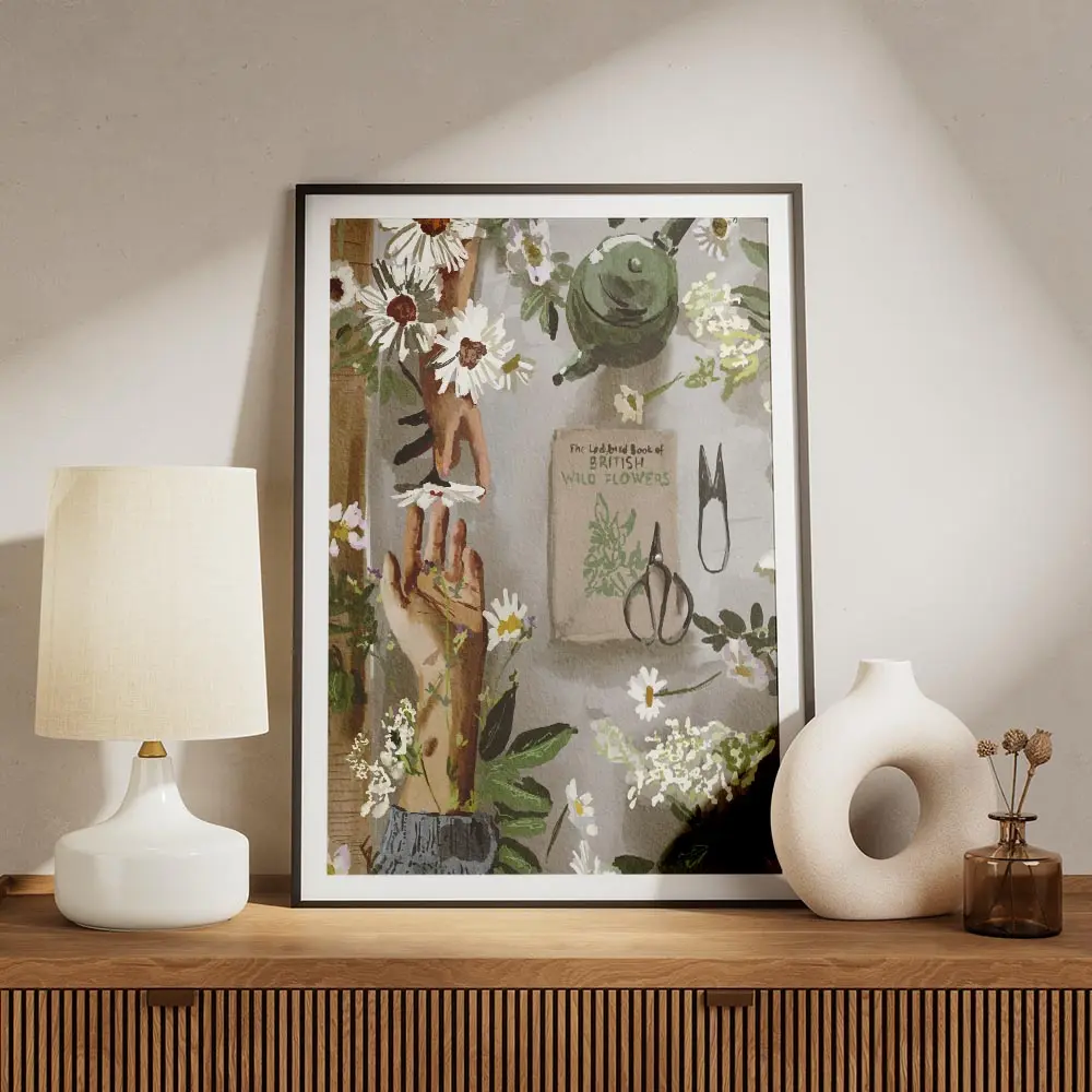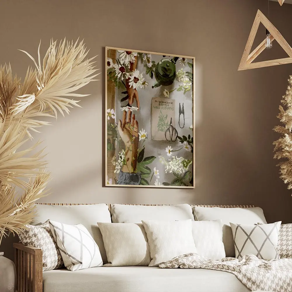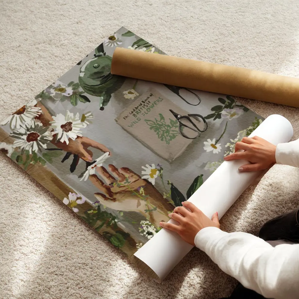 Ce poster Affiche mains fleurs livre arrosoir orange montre des mains qui tiennent des fleurs blanches, un livre posé à côté et un arrosoir vert. L’ensemble dégage une atmosphère douce, presque contemplative. Les textures se voient bien, la simplicité parle direct. Le rendu garde une simplicité qui respire, on aime ce calme.