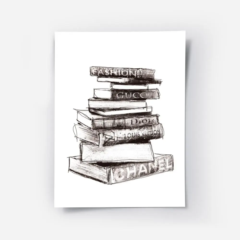 L'Affiche pile de livres sur la mode montre une pile de livres empilés verticalement, bien cadrée. On voit clairement les tranches des ouvrages, des titres imprimés sur les bords, et des variations de texture du papier. Le fond reste neutre et clair, ce qui fait ressortir les blocs de couleur des couvertures. L’éclairage marque des ombres droites sur la surface, et la composition joue sur les lignes horizontales formées par les tranches.