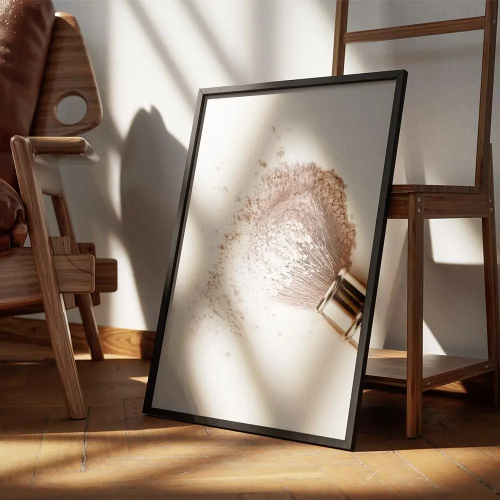 Affiche pinceau blush rose montre un gros plan d’un pinceau de maquillage en train d’étaler une poudre rose. On voit les poils du pinceau qui s’écartent, le nuage de poudre en suspension et des particules fines qui scintillent légèrement. Le fond reste clair et lumineux, il offre un contraste doux avec la teinte rose sans surcharger l’image. L’ensemble paraît frais, délicat et très tactile, on sent presque la matière.