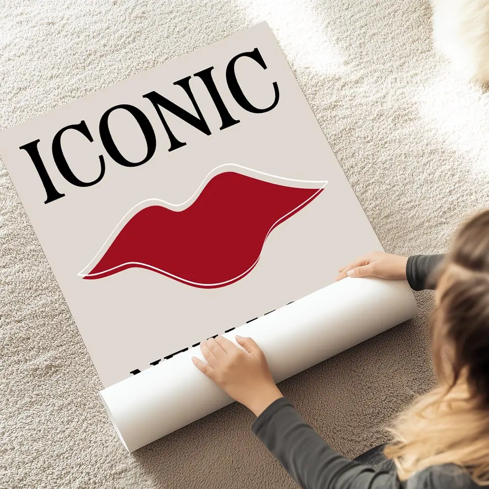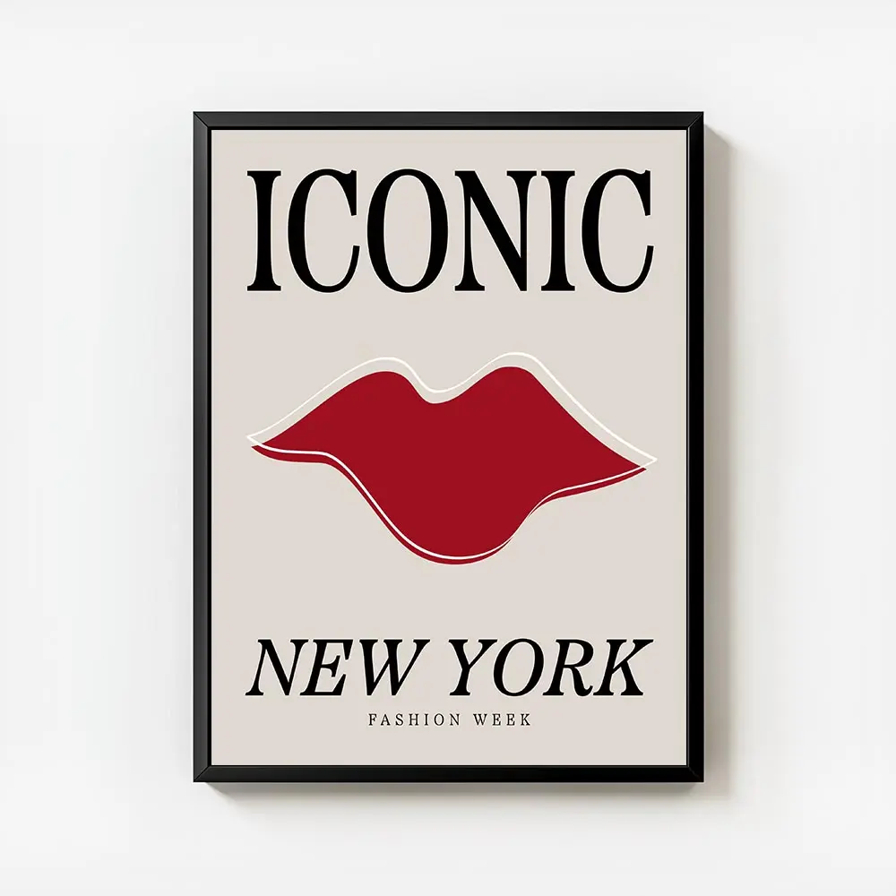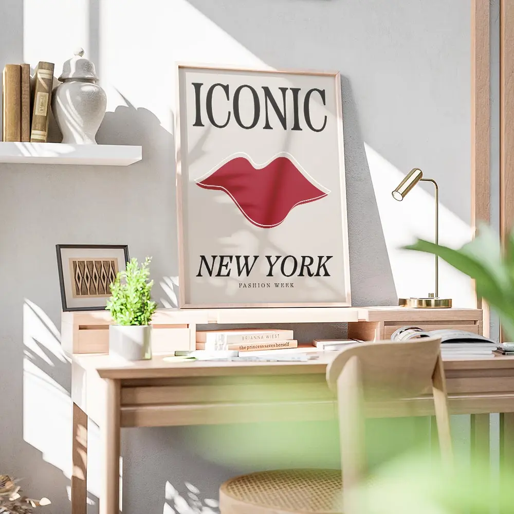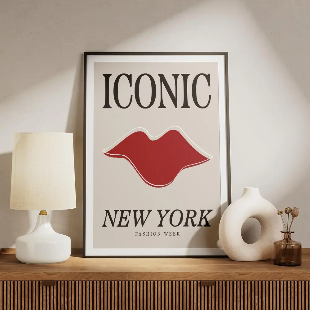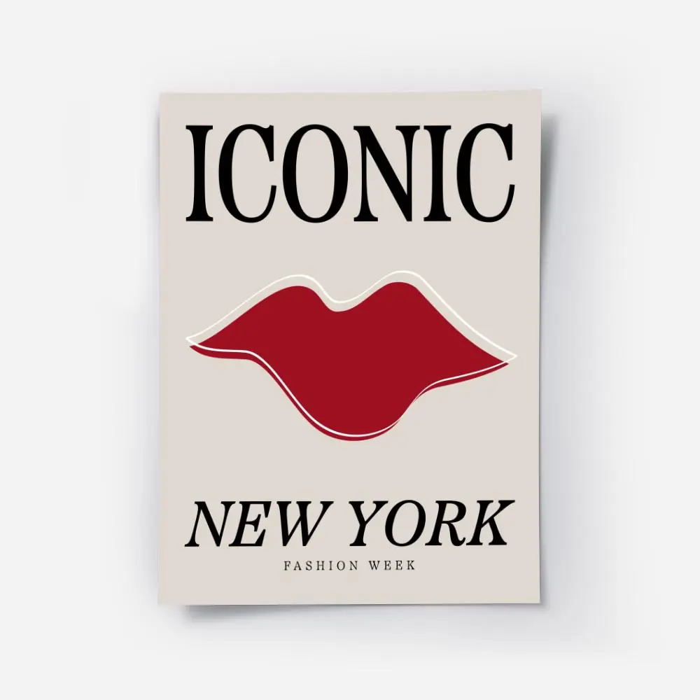 Ce poster Affiche bouche rouge texte iconic New York mise sur l’évidence. On voit une bouche rouge très présente, des lèvres pleines et un trait clair qui attire le regard. Du texte noir s’affiche en caractères simples et lisibles. Le fond beige uni offre une base douce, presque chaude, qui laisse respirer le visuel.