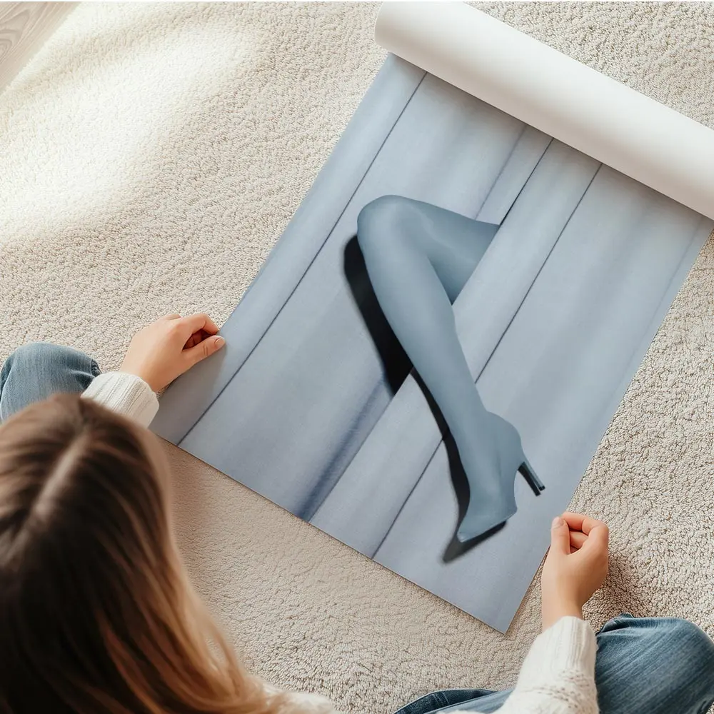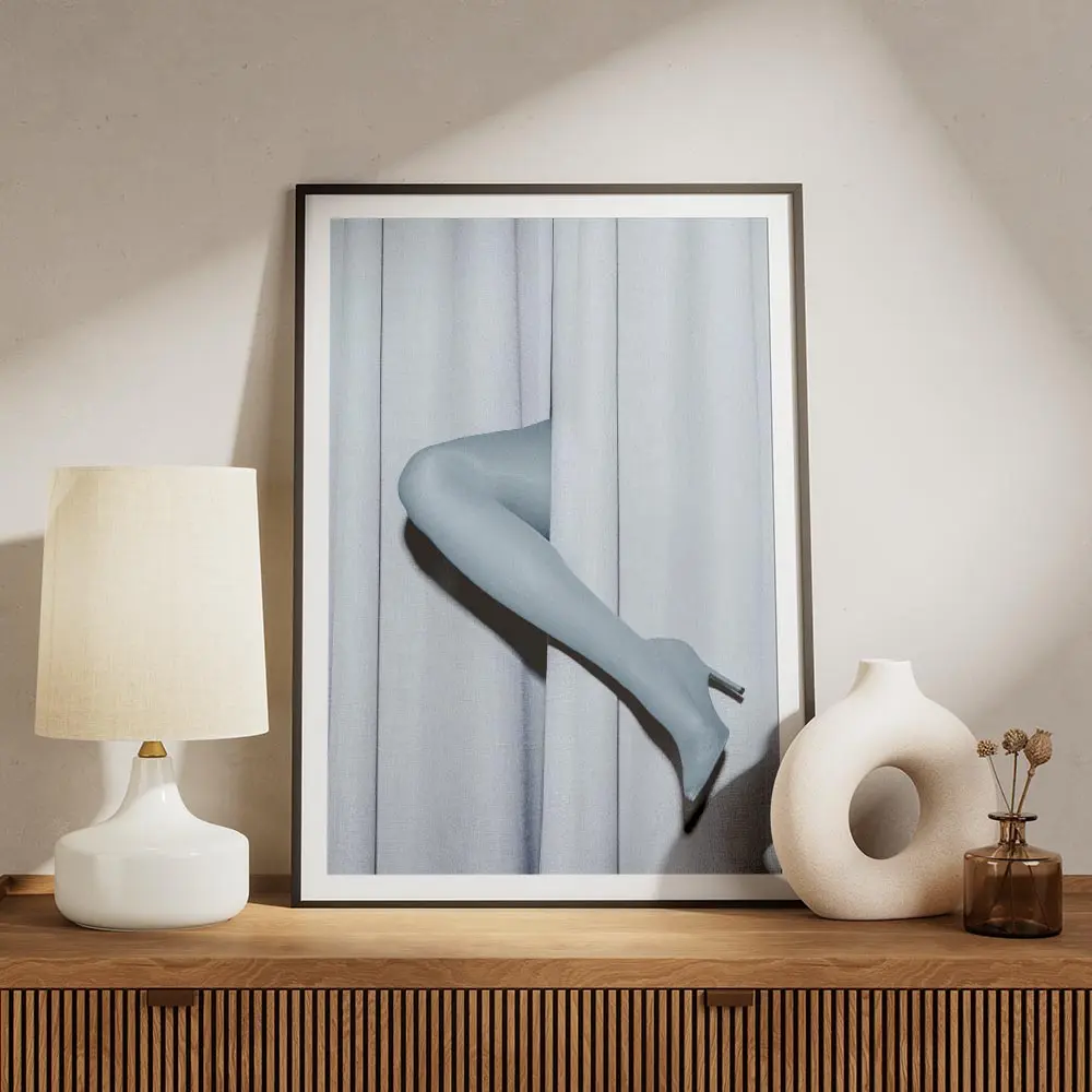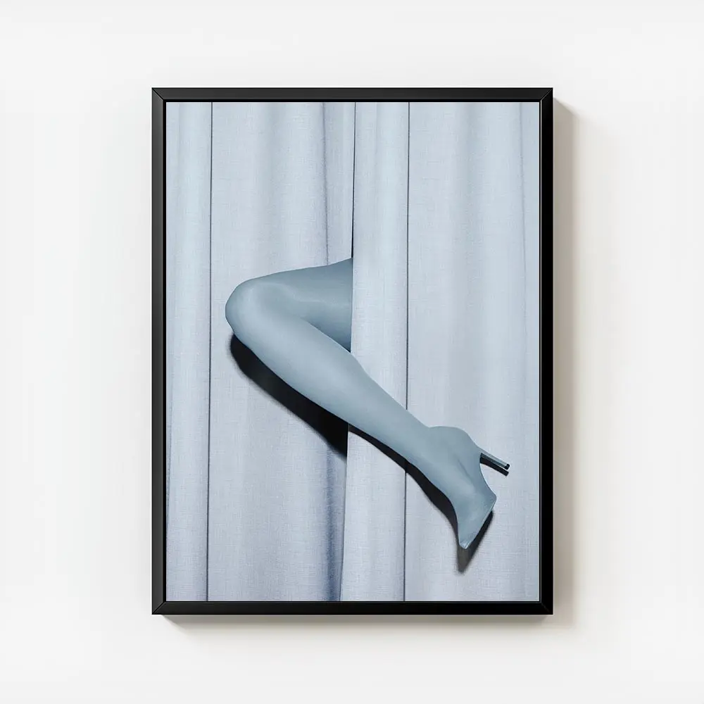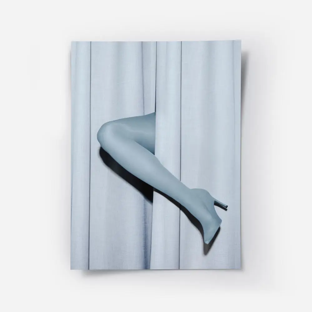 Cette Affiche jambes mannequin bleu rideau pastel montre deux jambes de mannequin bleu clair, lisses et sans détails superflus, qui émergent d’un rideau bleu pastel. Le rideau affiche des plis verticaux visibles, une texture douce et une lumière tamisée qui crée de légères ombres le long des bords. Le cadrage reste serré, centré sur la silhouette et la matière, simple et direct.