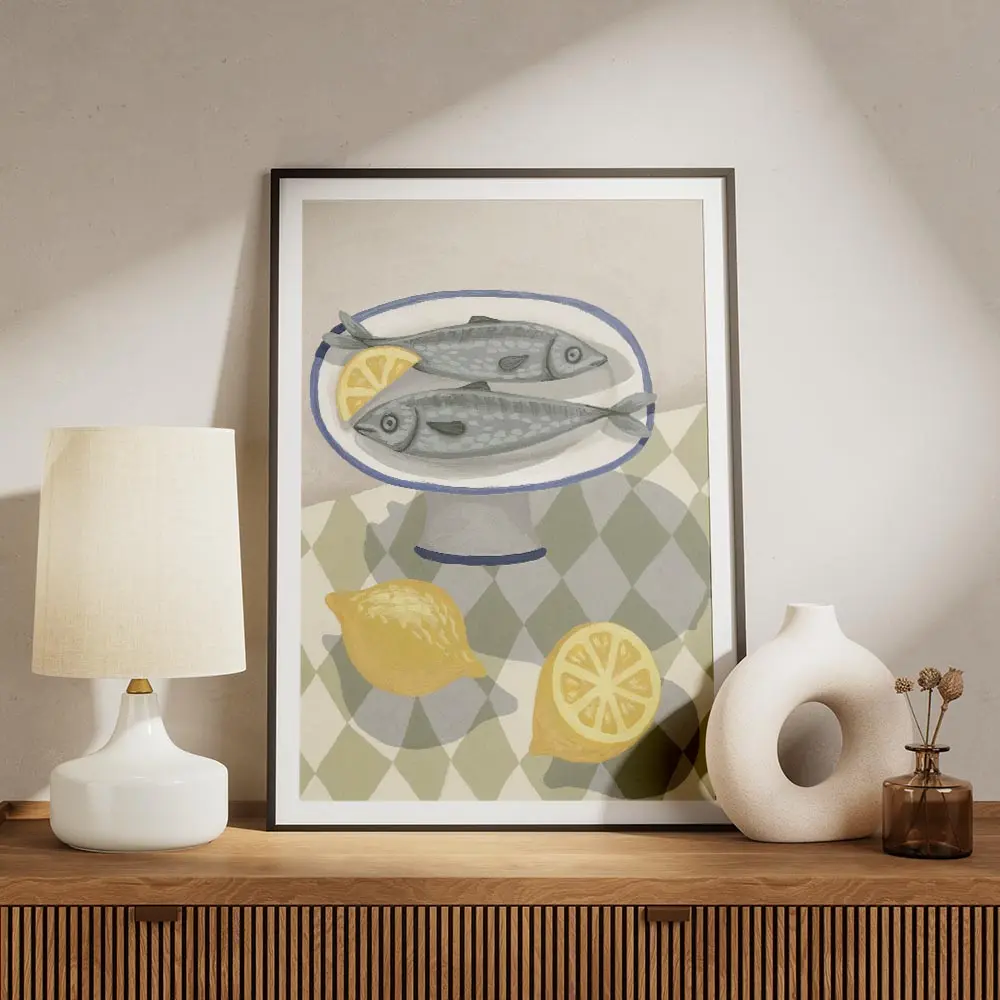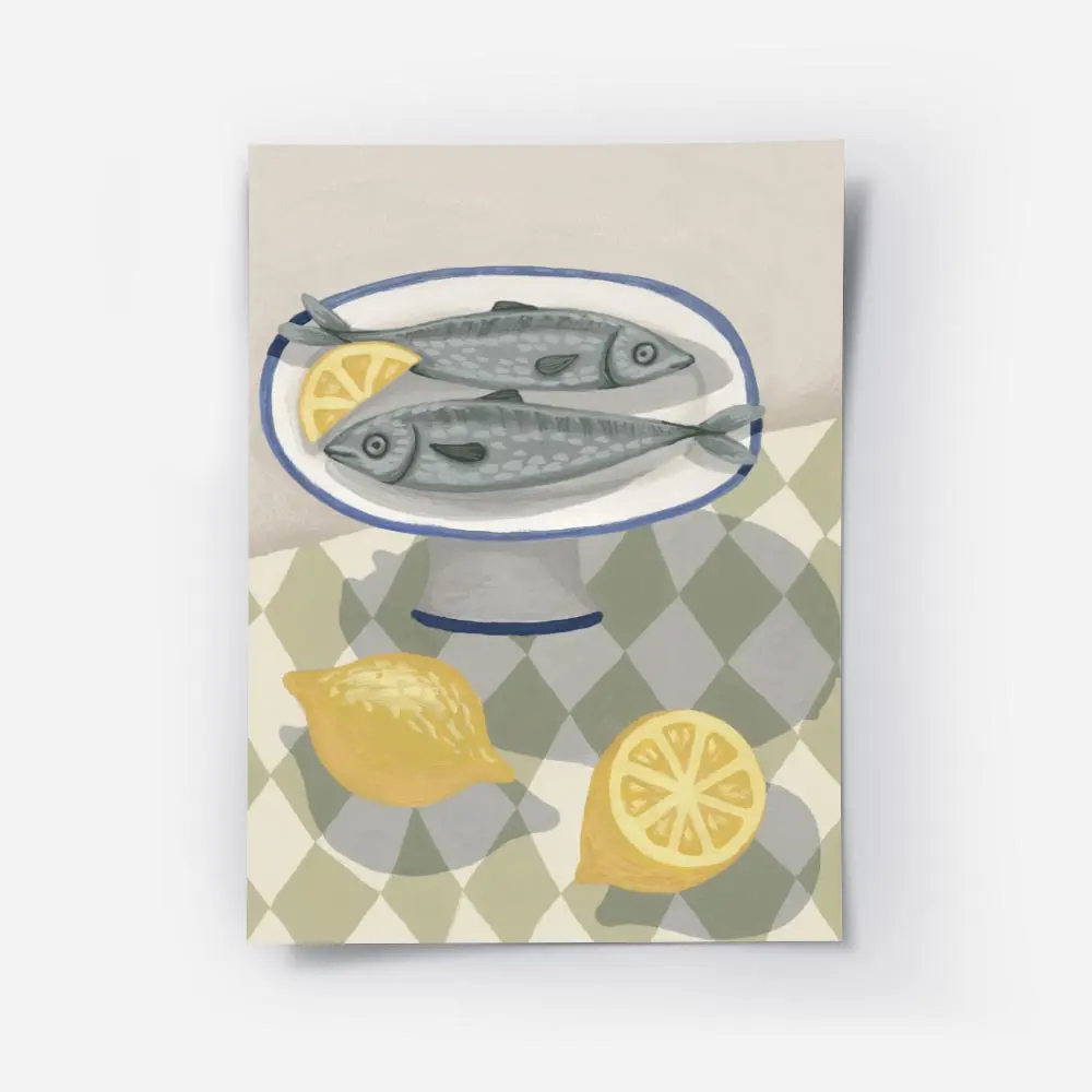 Ce poster Affiche deux sardines assiette citron frappe par sa composition claire et directe. On voit deux sardines posées côte à côte sur une assiette blanche, la peau argentée qui capte la lumière. Un citron entier et plusieurs quartiers coupés ajoutent une touche jaune vive, presque solaire. L’image respire calme et simplicité, nette et minimaliste.