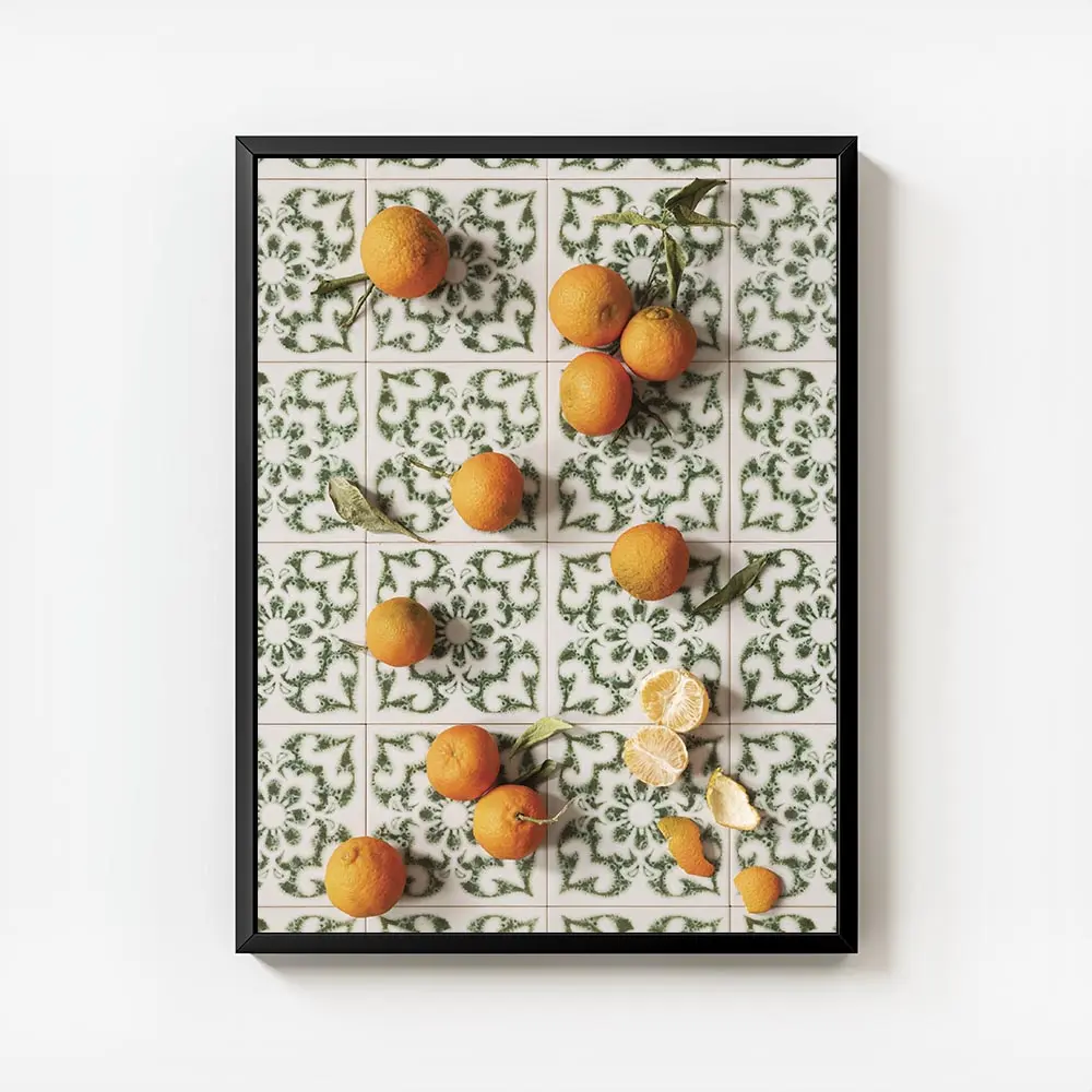 Cette Affiche mandarines nature morte graphique montre des mandarines orange vif, une mandarine ouverte avec les quartiers bien visibles, et des épluchures posées en rubans autour. Le fond reste neutre et clair, presque crème, ce qui fait ressortir les couleurs. On voit la peau texturée, quelques petites ombres et un gros plan qui donne une sensation intime, rapprochée.