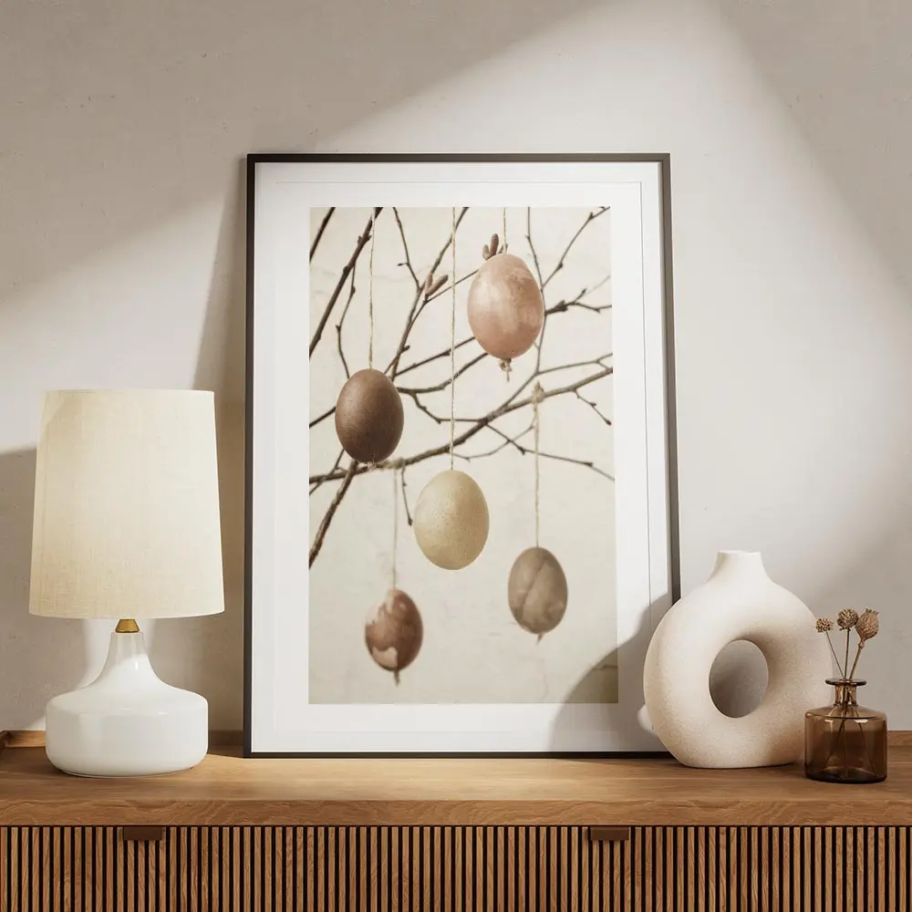 Ce Affiche œufs peints terreux montre des œufs peints aux tons terreux, suspendus à de fines branches. Le montage reste simple et chaleureux. On remarque des nuances ocre, brun chaud et vert olive, des petites cordelettes qui tiennent chaque œuf, et quelques ornements discrets collés ou peints sur les surfaces.