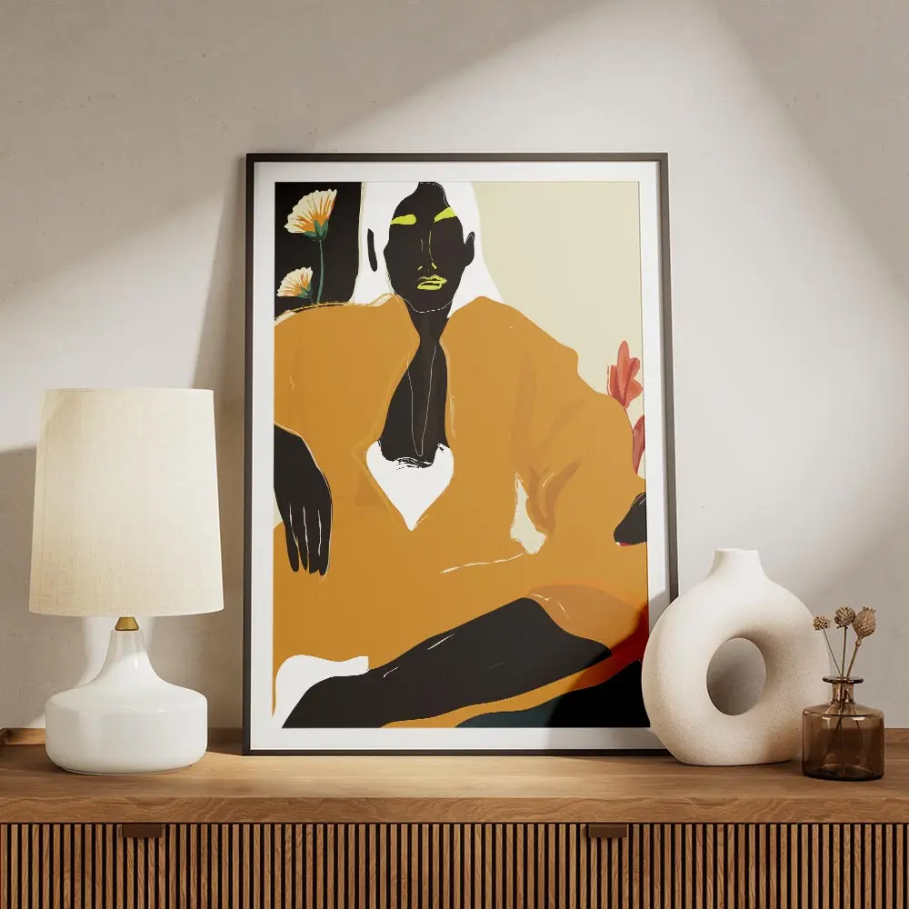 On l’associe à des murs blancs ou beige, du bois clair et des accessoires en terre cuite pour renforcer la chaleur. Une lampe à lumière douce, un tapis discret et un cadre fin noir fonctionnent bien. Le format marche au-dessus d’un meuble bas ou en pendant dans un salon. Pour composer un mur, on peut aussi explorer nos illustrations ou regarder la sélection mode.
