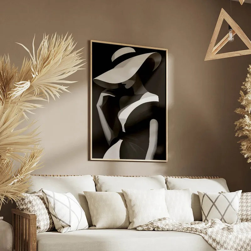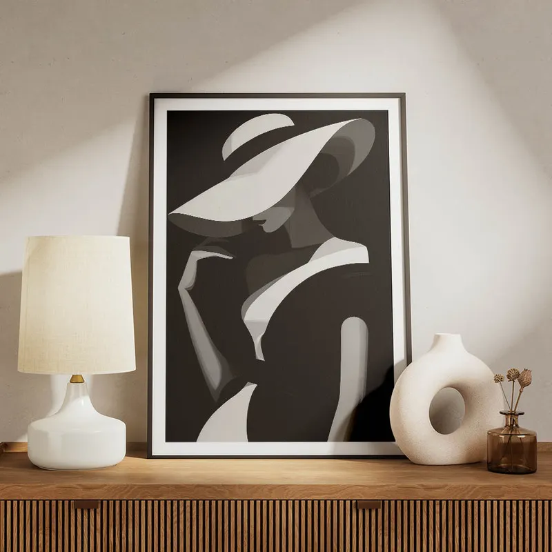 Ce qui est incroyable, c'est comment le chapeau ajoute un je-ne-sais-quoi à l'ensemble. On dirait qu'elle est prête à s'envoler vers une belle aventure. Ça nous inspire, on aimerait savoir ce qu'elle pense, où elle va, et tout ça... On se laisse un peu emporter par ses pensées. Cette affiche pourrait vraiment donner du caractère à n'importe quelle pièce. On l'imagine bien dans un salon tendance ou même dans une chambre, pour un style chic et intemporel.
