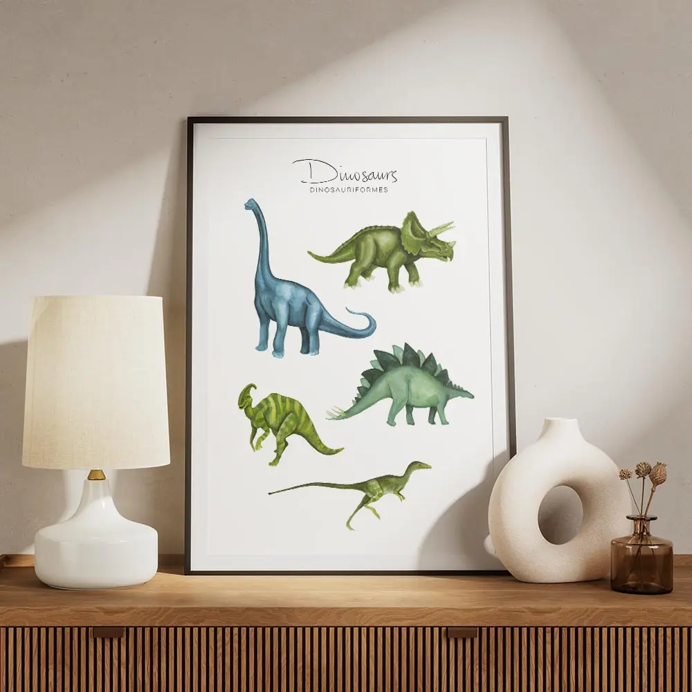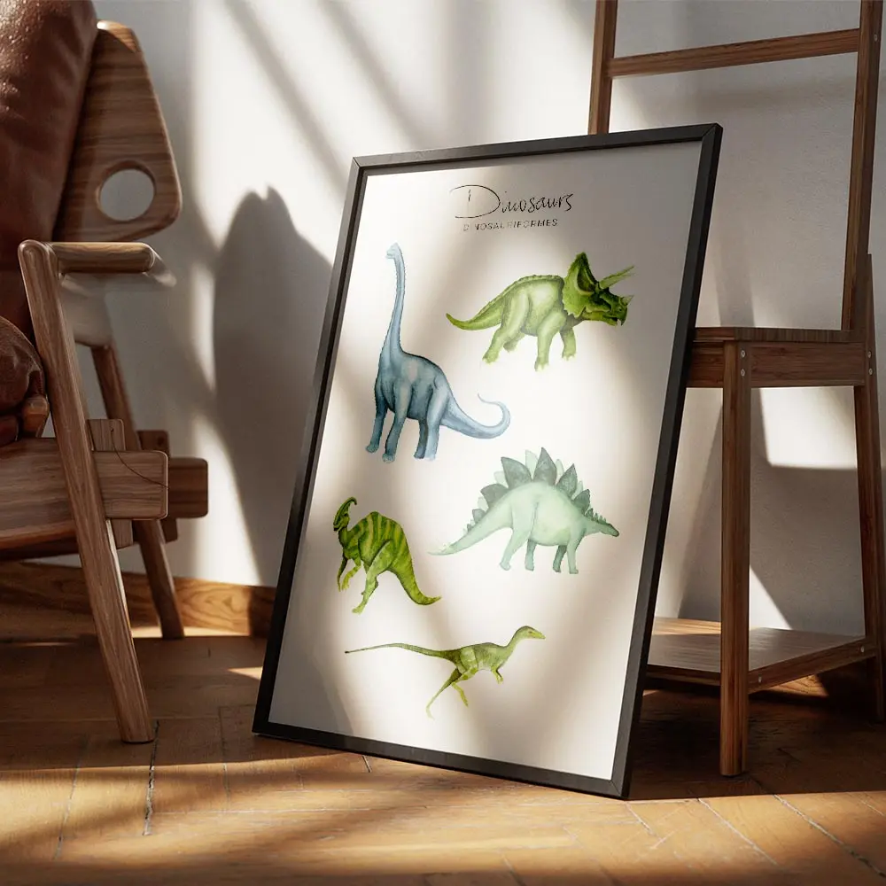 Le poster Affiche dinosaures colorés pour enfants joue la carte du sourire. On voit un grand brachiosaure au cou long, entouré de plusieurs dinosaures aux couleurs vives. Les formes restent arrondies, les yeux ronds et les traits graphiques restent simples. Le fond clair met en valeur chaque couleur, on lit tout de suite l’univers enfantin.