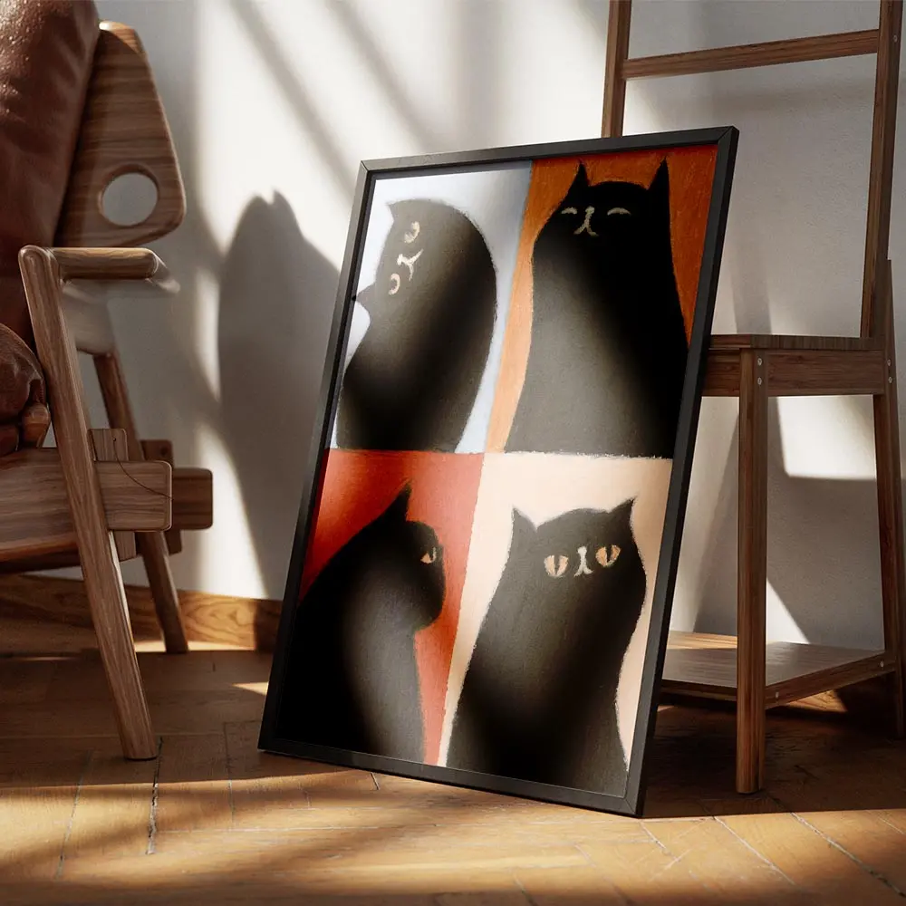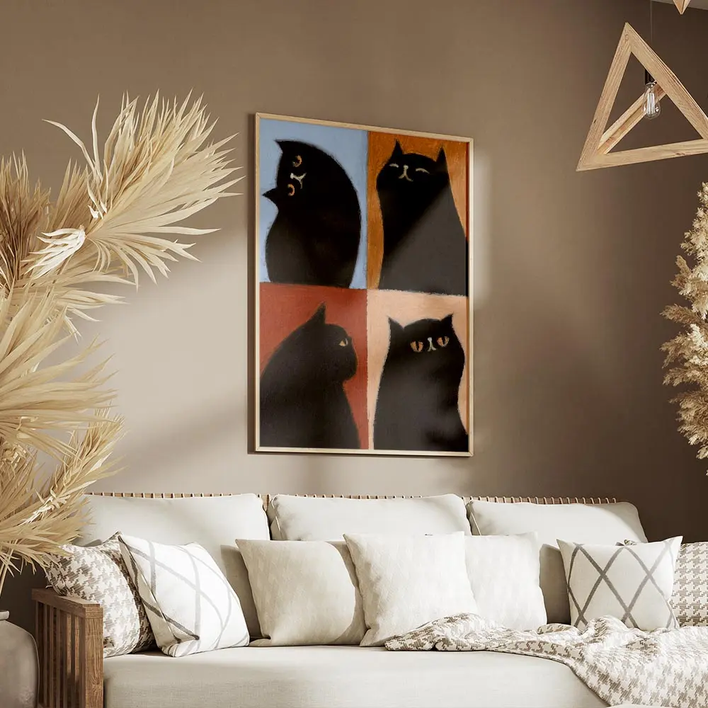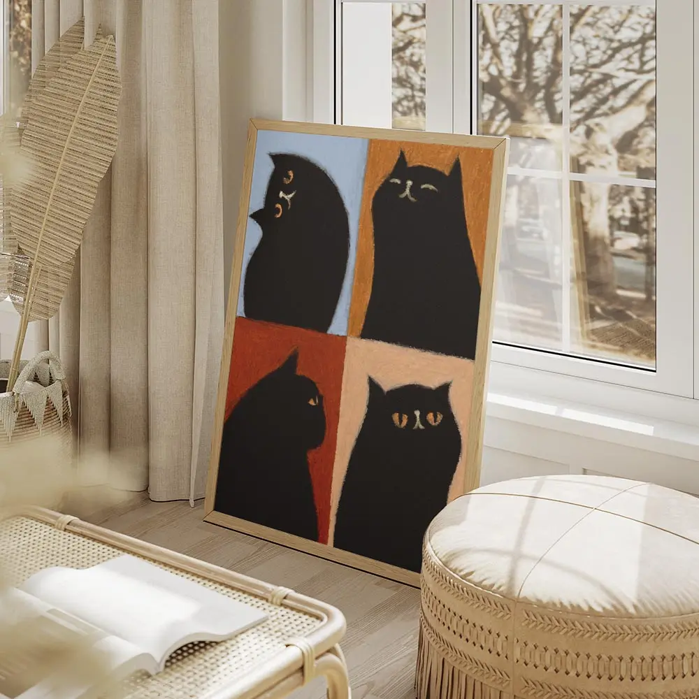 Ce Affiche quatre chats noirs fonds colorés montre quatre chats noirs alignés sur des blocs de couleur. On voit des fonds bleu et orangé qui s’alternent. Le cadrage privilégie le gros plan des têtes. Les expressions varient, du regard curieux au visage plus sérieux. Le contraste reste net, très graphique. Les cases occupent presque autant d’espace et donnent un rythme au visuel.