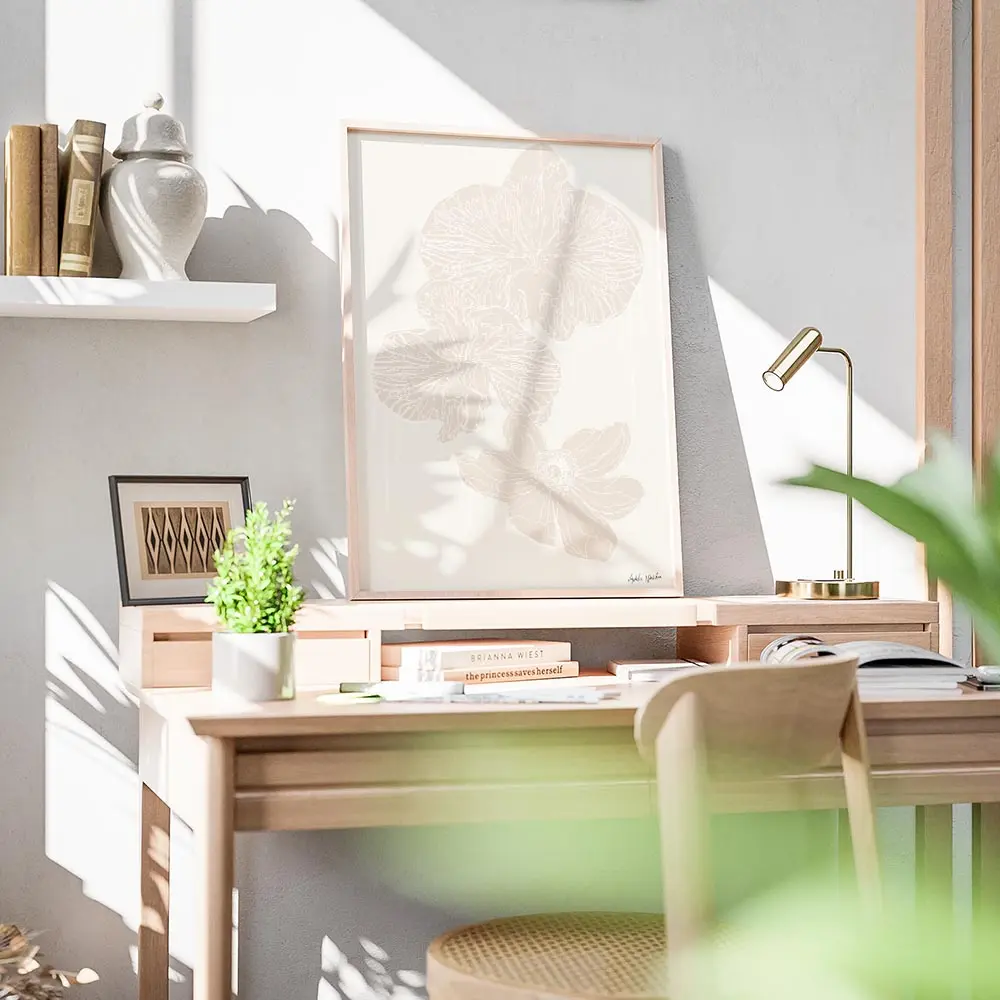 Ce poster s’accorde avec du bois clair, des matières naturelles et des tons neutres. Pour plus de contraste, ajouter un cadre noir fin ou des accessoires noirs. Il fonctionne bien dans un salon, une chambre ou un bureau minimaliste. Pour continuer dans la même veine, découvrir nos sélections de posters fleurs ou d’illustrations au trait.