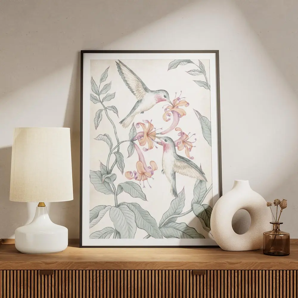 Ce Affiche colibris et fleurs orange montre des colibris illustrés en plein vol, posés parmi des fleurs orange vives et des feuilles vertes. Le fond reste clair, presque crème, et fait bien ressortir les teintes chaudes. On ressent la légèreté du geste, on ressent le calme, il y a un petit rythme qui revient.