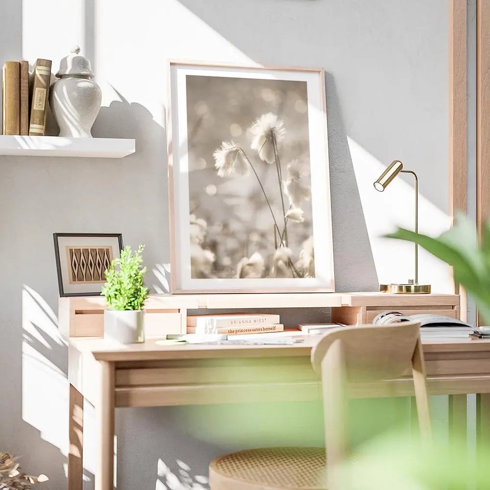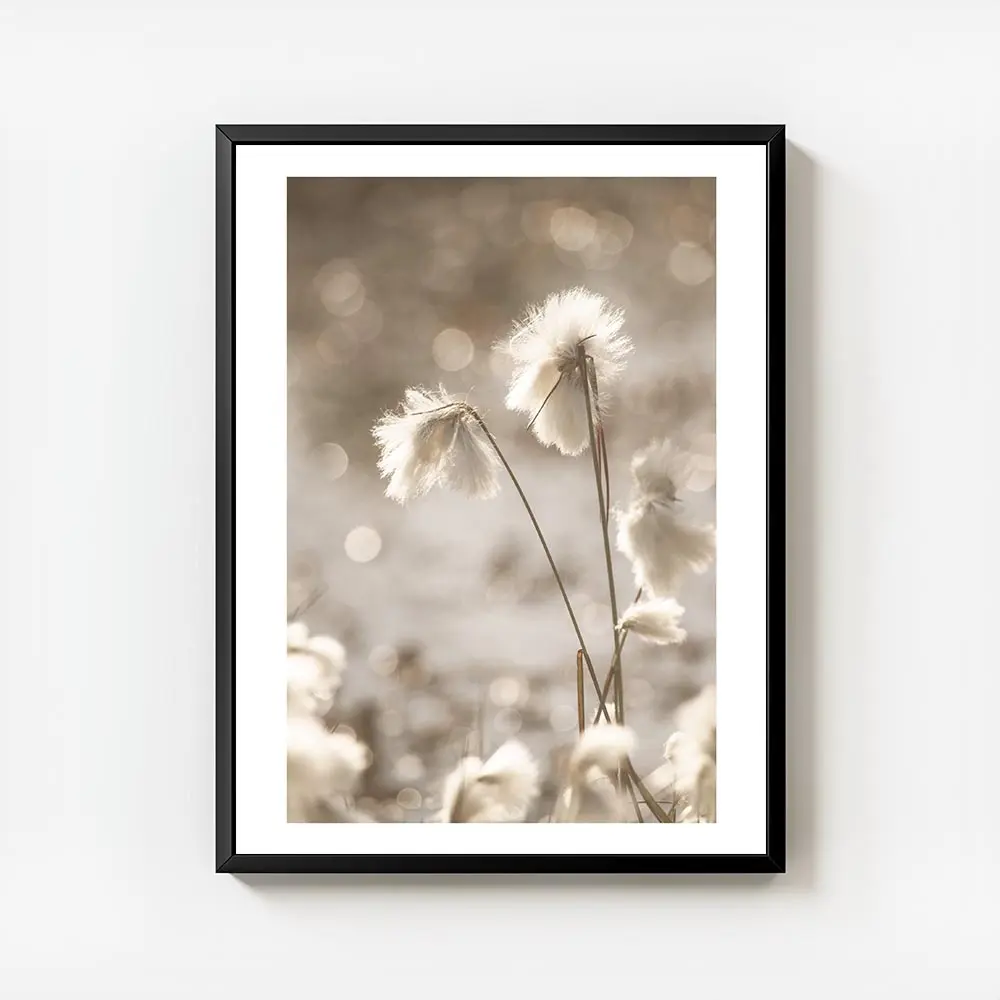 Ce poster Affiche fleurs de coton blanches apaisantes montre des boules de coton blanches et duveteuses sur des tiges fines brunes, au premier plan. La lumière reste chaude et douce, elle effleure les fibres et crée des ombres légères qui adoucissent l’ensemble.