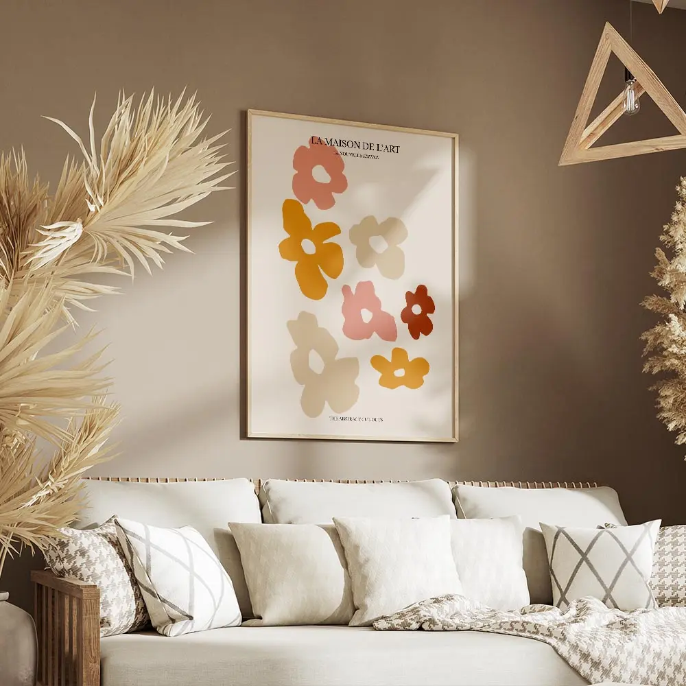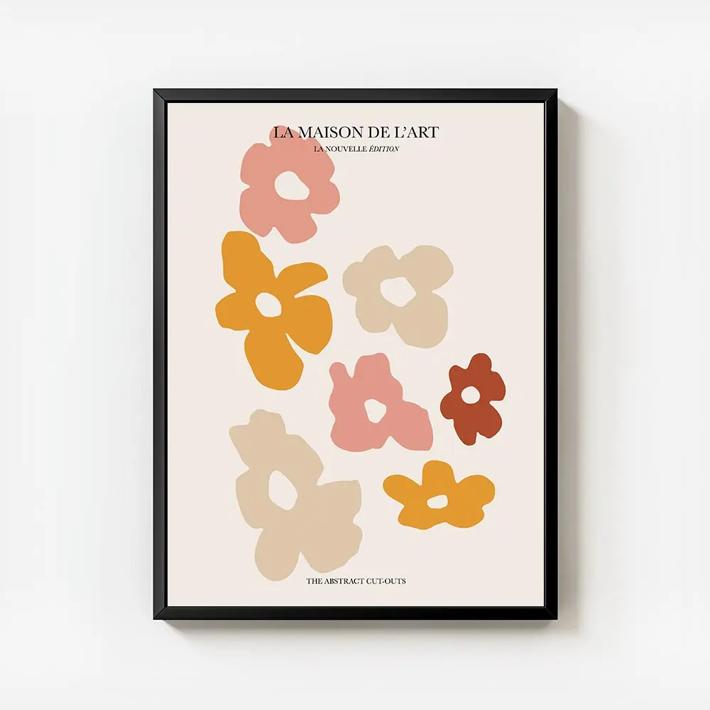 Cette Affiche fleurs découpées roses orange beige offre un rendu simple et élégant. On voit des fleurs stylisées comme découpées dans du papier, empilées sur un fond clair. Les tons dominants sont le rose, l’orange et des beiges doux. Les formes présentent des contours nets et des pétales arrondis. L’ensemble donne une impression de collage, minimal et très soigné.