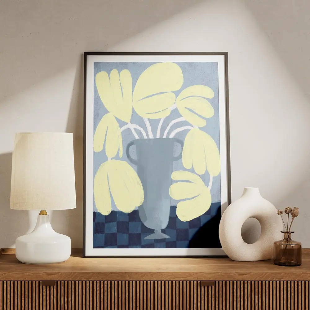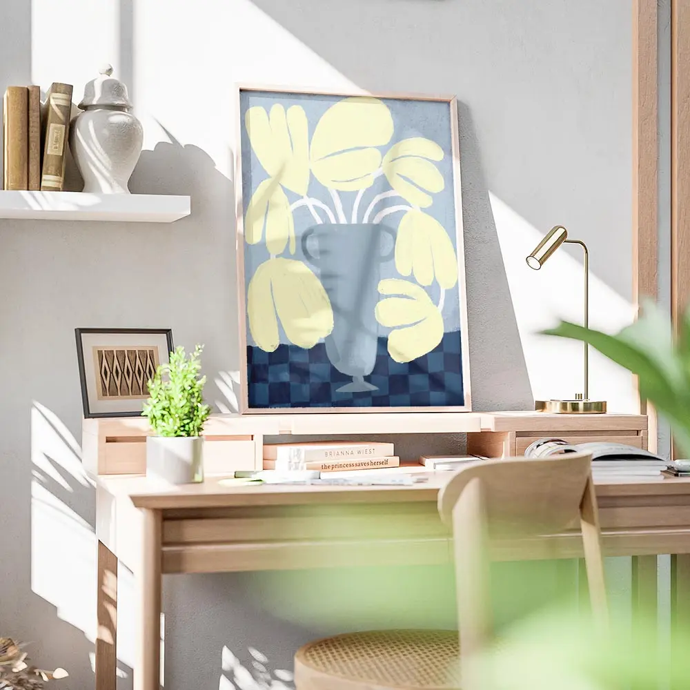 Sur un mur blanc ou beige, les jaunes explosent. On peut ajouter des accents bois clair, un cadre fin noir ou blanc, et une petite lampe en céramique pour jouer les textures. Ce poster s’intègre bien dans une déco scandinave, minimaliste ou contemporaine. Pour aller plus loin, on peut associer avec nos posters fleurs ou explorer les posters art abstrait.