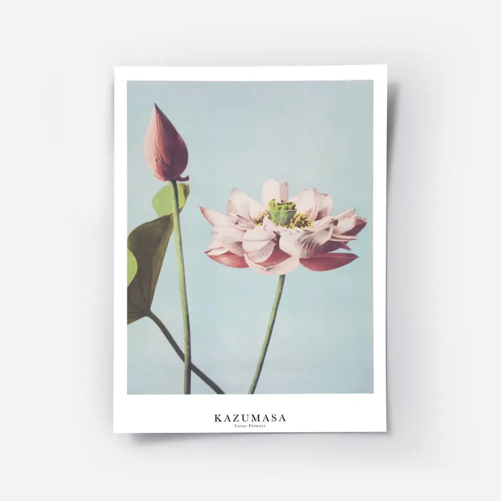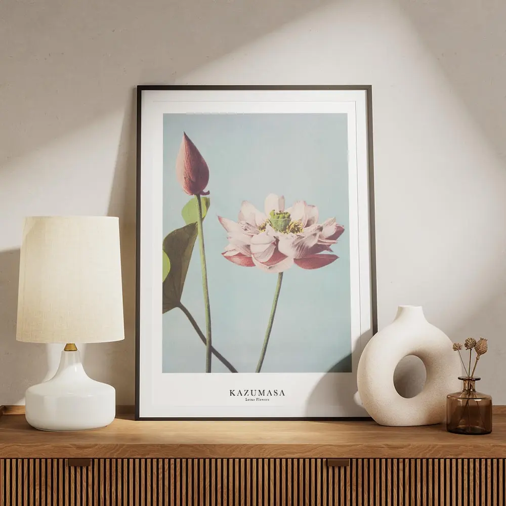 Ce Affiche lotus roses sur fond bleu ciel montre des fleurs de lotus roses aux pétales arrondis posées sur de longues tiges vertes. Le fond bleu ciel uni donne une sensation légère. On remarque aussi quelques boutons encore fermés et des variations subtiles de rose.