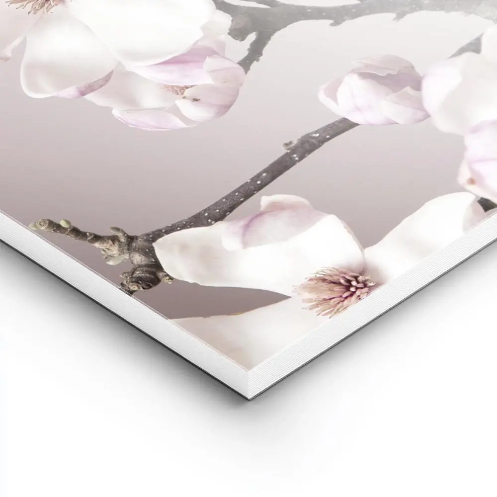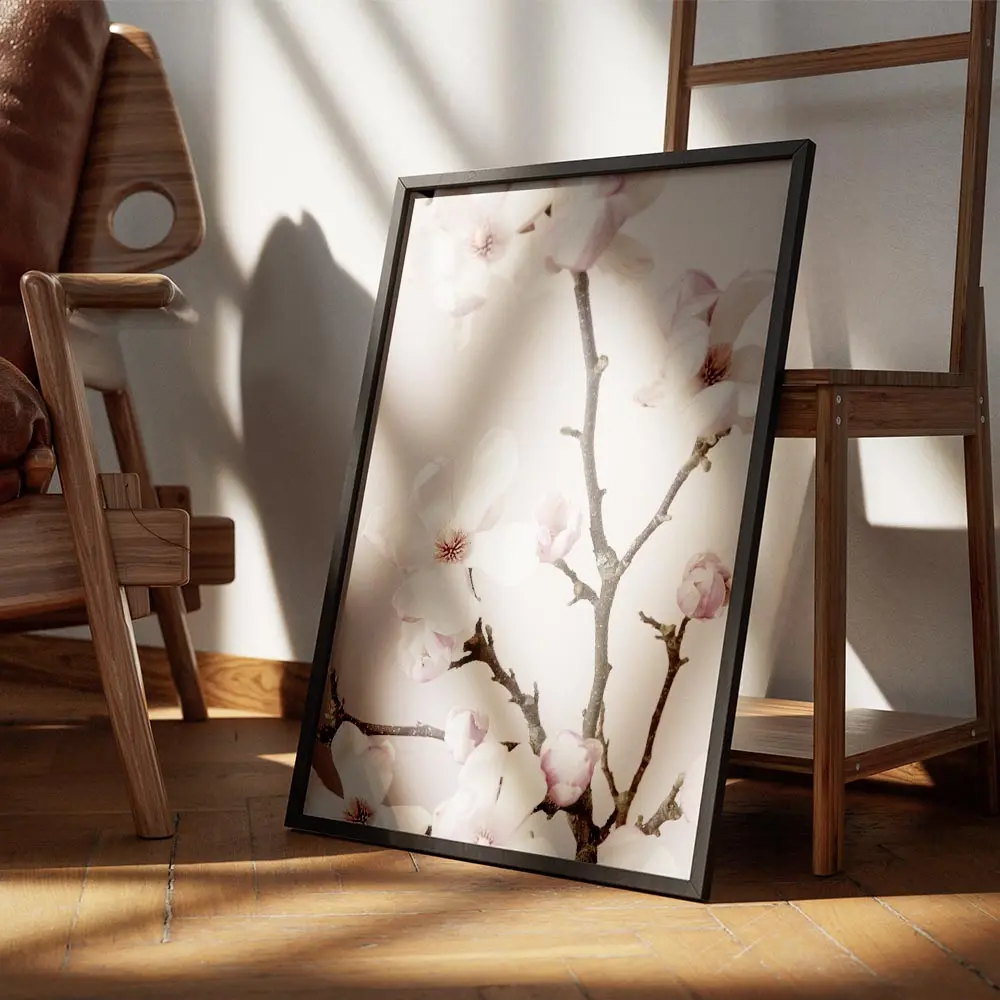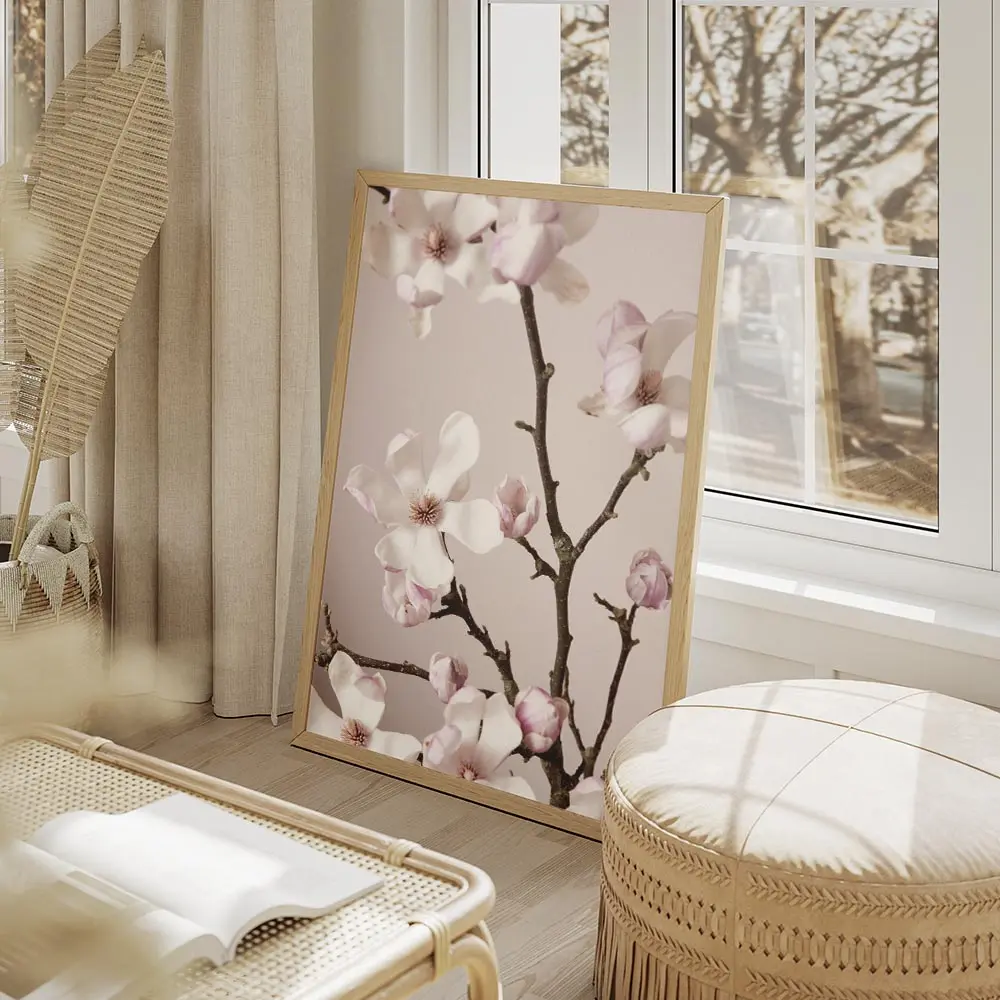 Cette Affiche magnolias roses et blanches pastel montre des fleurs de magnolia aux pétales roses pâle et blancs sur un fond pastel très doux. On voit des branches fines brunes qui parcourent l’image, des pétales larges et satinés, et un contraste subtil entre clair et tendre. L’ensemble reste épuré, calme et lumineux.