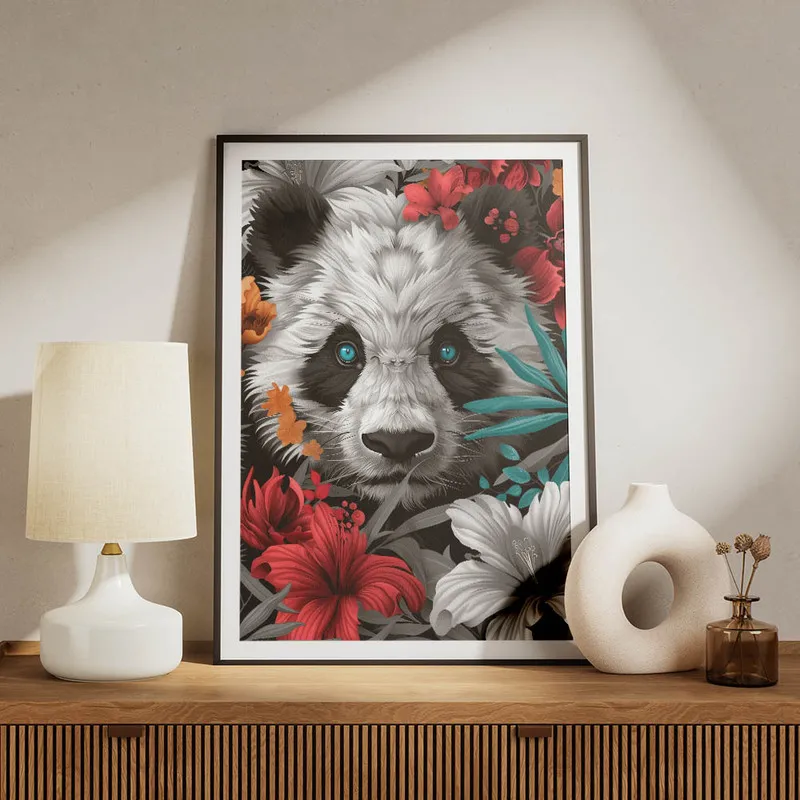Ce qui nous frappe, c'est les détails de ce poster. Le panda a un regard qui nous touche, comme s'il avait une petite histoire à raconter. Les fleurs ajoutent une touche de couleur, et l'ensemble, c'est juste un régal pour les yeux. Ça sent le printemps, la légèreté. On s'imagine déjà l'accrocher dans une chambre ou un salon, pour apporter une vibe zen et apaisante.
