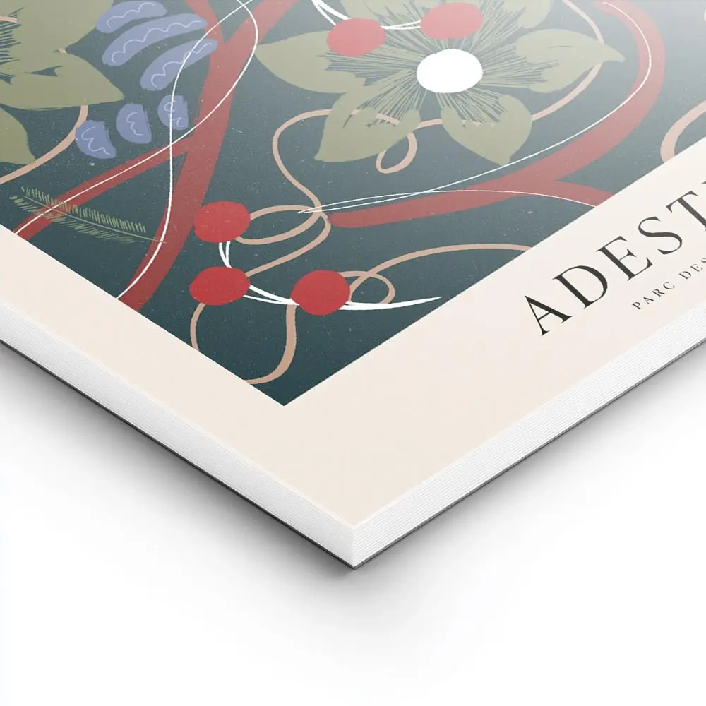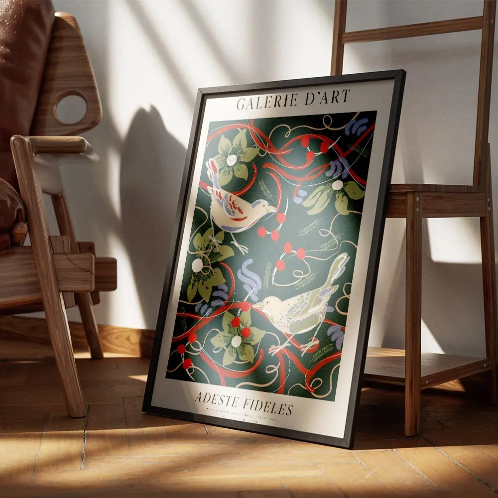 Ce Affiche deux oiseaux et fleurs de Noël montre deux oiseaux colorés posés sur une branche. On voit des fleurs de Noël aux pétales rouges, des baies rouges brillantes et des feuilles vertes qui entourent les oiseaux. Le rendu reste lumineux, le fond clair met tout de suite le sujet en valeur.