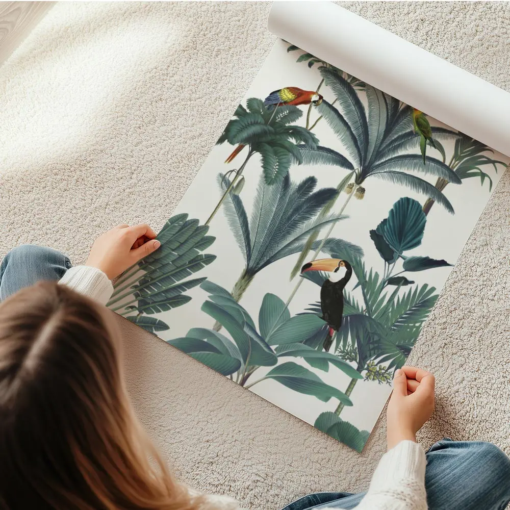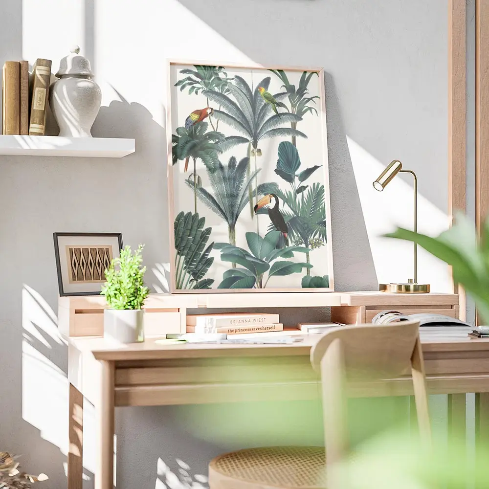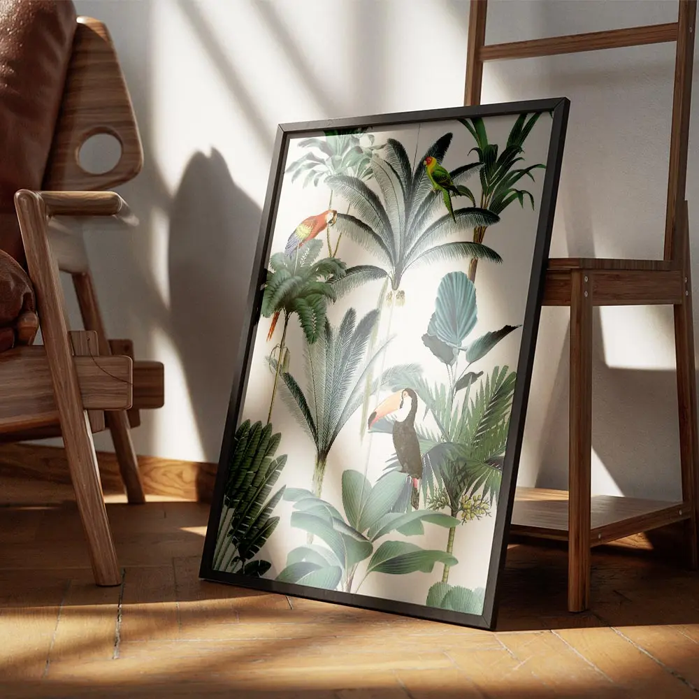 Sur un mur beige ou blanc, les couleurs explosent et créent un point focal. On peut ajouter des coussins verts, des paniers en osier et une plante verte pour rappeler la jungle. Cette affiche marche avec un style bohème, exotique ou nature.