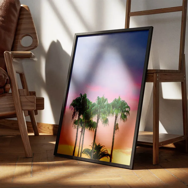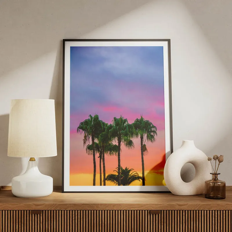 On ne peut que fondre devant ce Poster palmiers au crépuscule. En le voyant, on ressent tout de suite une douce chaleur, comme celle d'une fin de journée à la plage. Les palmiers se découpent silhouette contre un ciel aux teintes dorées et roses, c'est vraiment un spectacle qui nous rappelle des souvenirs d'évasion. Qui n'a jamais rêvé de plages paradisiaques et de couchers de soleil fascinants ?