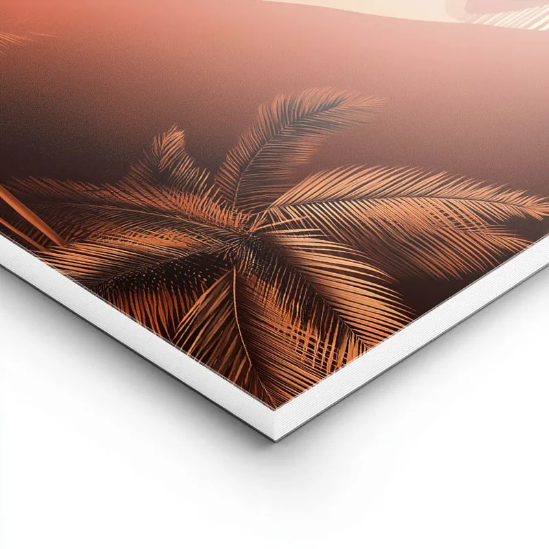 On est vraiment tombé amoureux du Poster paysage rétro palmiers coucher de soleil. Ce qu'on ressent, c'est une vraie invitation à la détente et à l'évasion. Les couleurs chaudes de ce coucher de soleil, avec ces palmiers qui se balancent doucement, ça nous fait rêver. On a presque l'impression d'entendre le bruit des vagues, tellement c'est apaisant.
