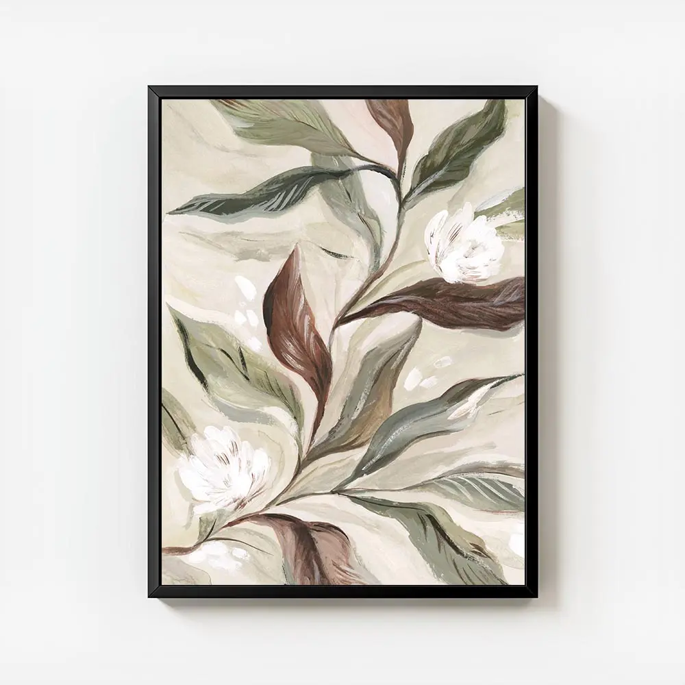 Ce Affiche botanique rustique crème propose un dessin épuré sur un fond crème chaud. On voit des feuilles vertes et des feuilles brunes, des tiges fines et plusieurs fleurs blanches posées ici et là. L'ensemble reste calme, naturel et légèrement rustique, avec des contours nets et une composition aérée.