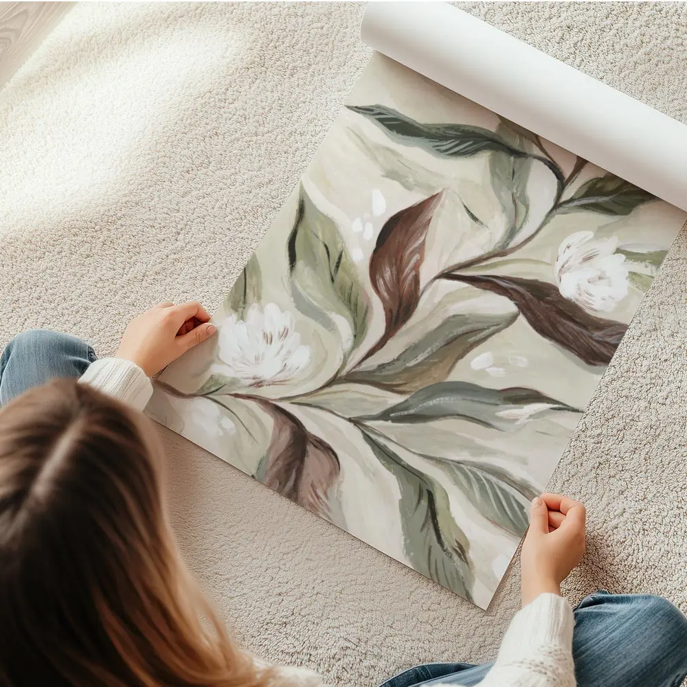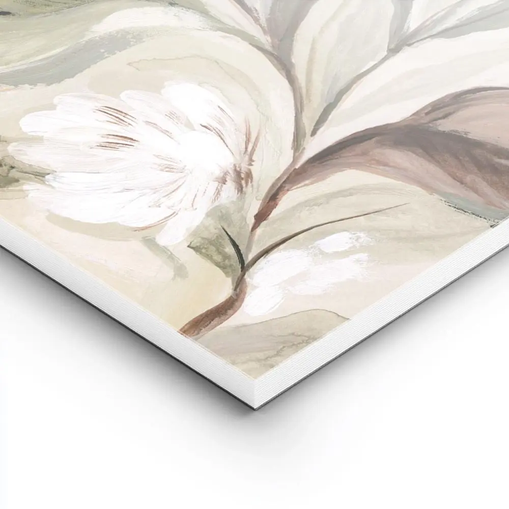 Les feuilles varient en taille: grandes feuilles vertes, petites feuilles brunes et quelques bourgeons clairs. Les fleurs blanches apportent des points de lumière. Le fond crème relie le tout et renforce le côté doux. On peut détailler les tiges, elles restent fines et régulières, pas surchargé, tout reste lisible, simple.