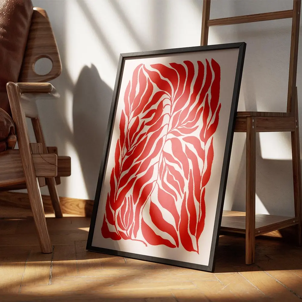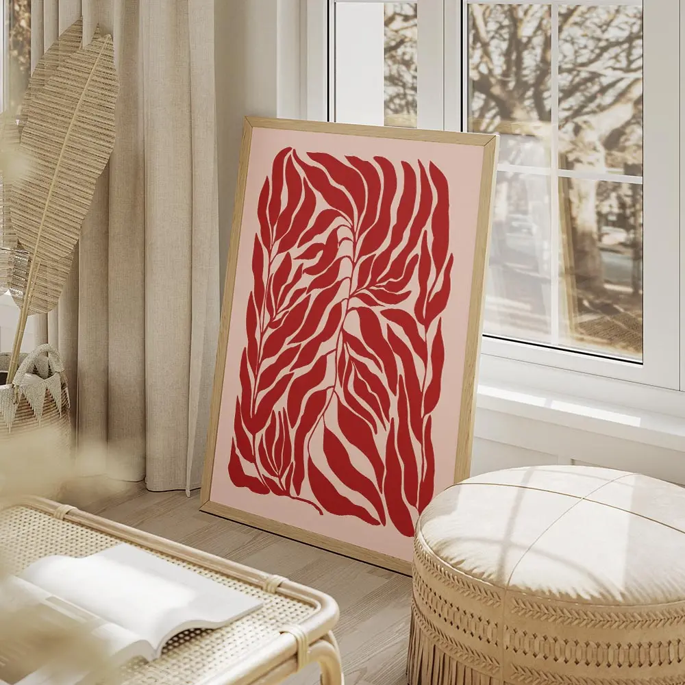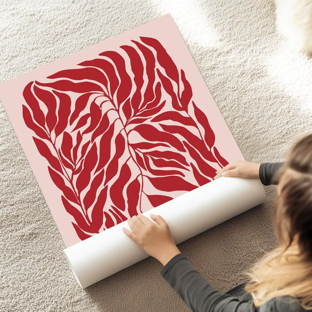 Cette affiche attire le regard avec des feuilles rouges posées sur un fond rose uni. Affiche feuilles rouges fond rose graphique montre un motif graphique, répétitif et ordonné. Les formes restent simples, les contours nets, la palette se limite au rose et au rouge. On sent une ambiance douce, mais vive.