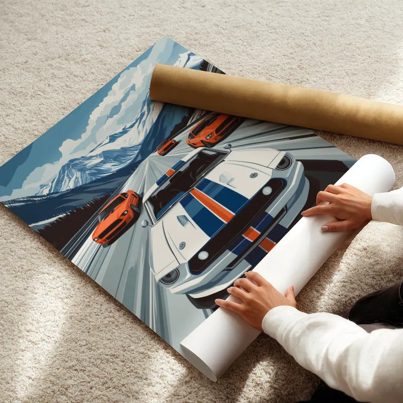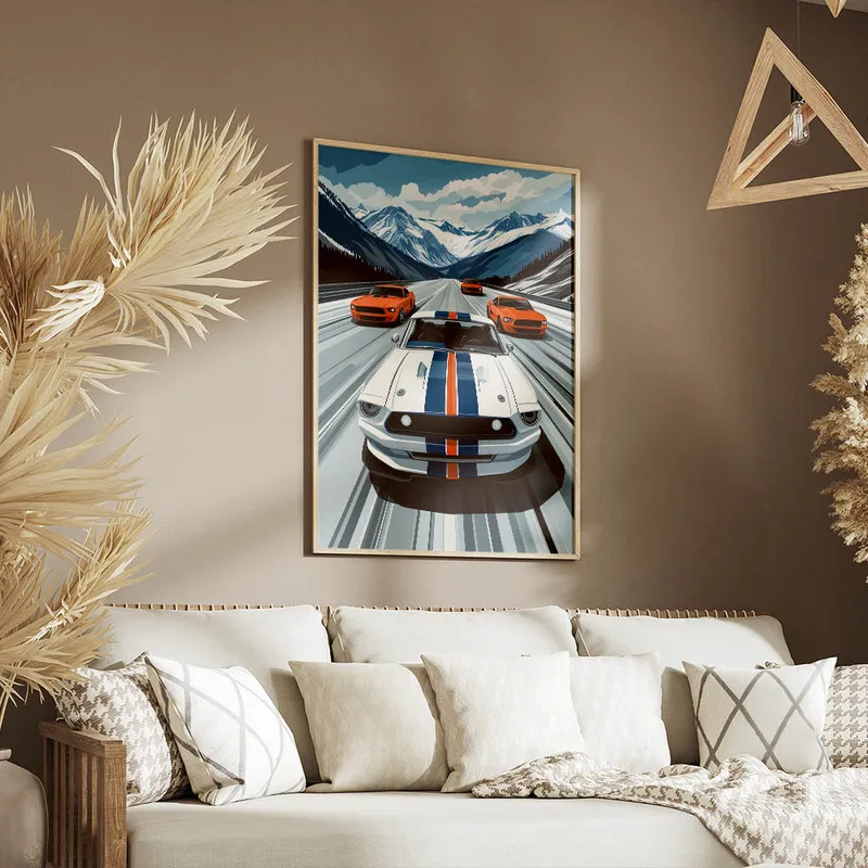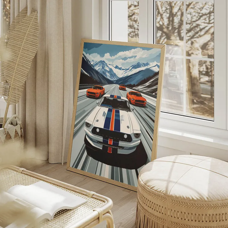 On est littéralement sous le charme du Poster illustration Ford Mustang. Dès qu'on l'aperçoit, on ressent une vague de nostalgie, un petit frisson d'excitation. Ce modèle emblématique dégage une telle personnalité, pas vrai ? La belle silhouette de la Mustang, c'est un peu comme un clin d'œil à toute une époque où la vitesse et l'élégance se mêlaient à la perfection.
