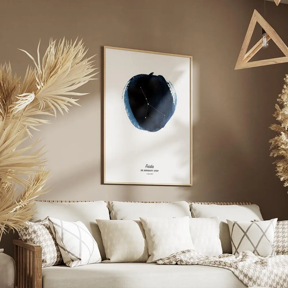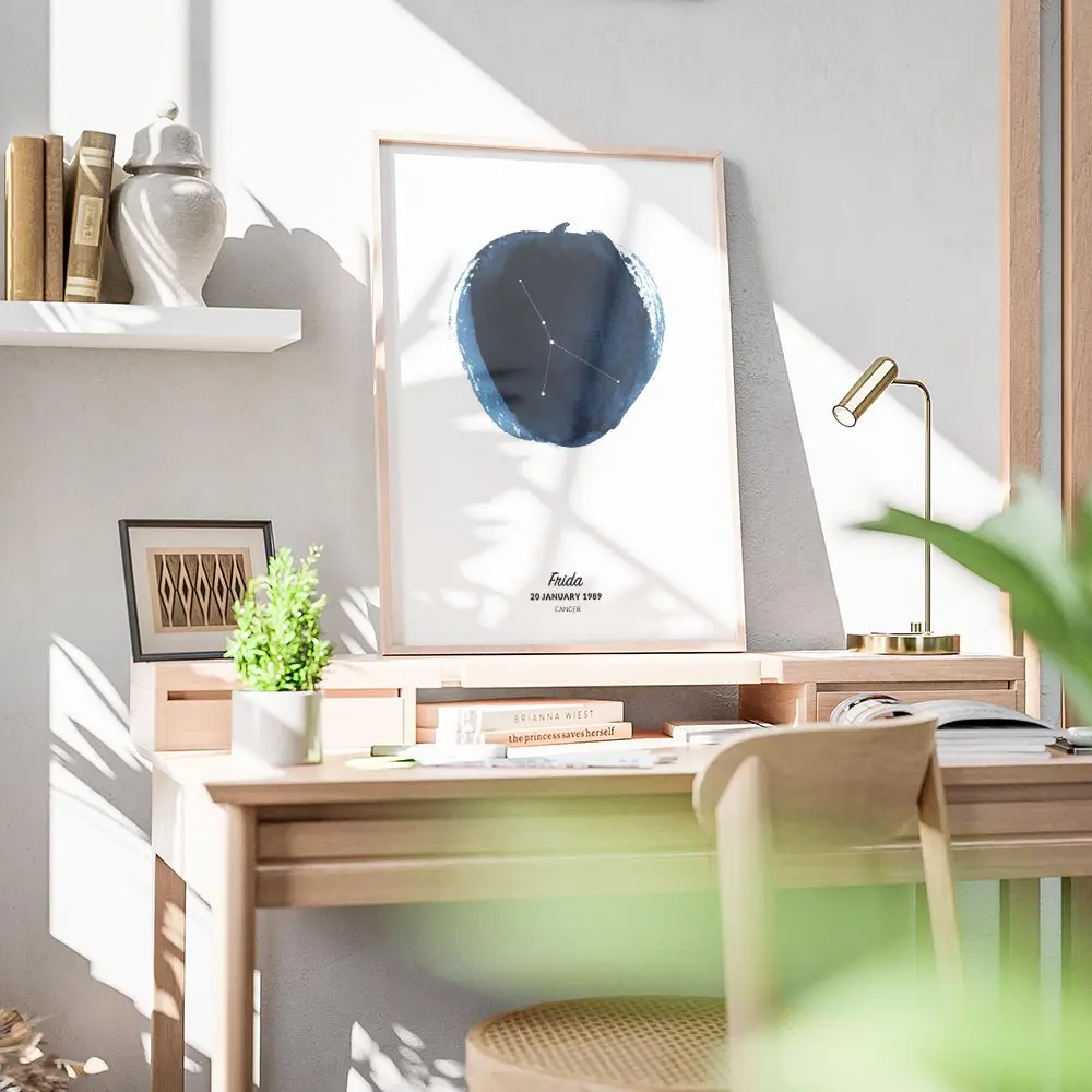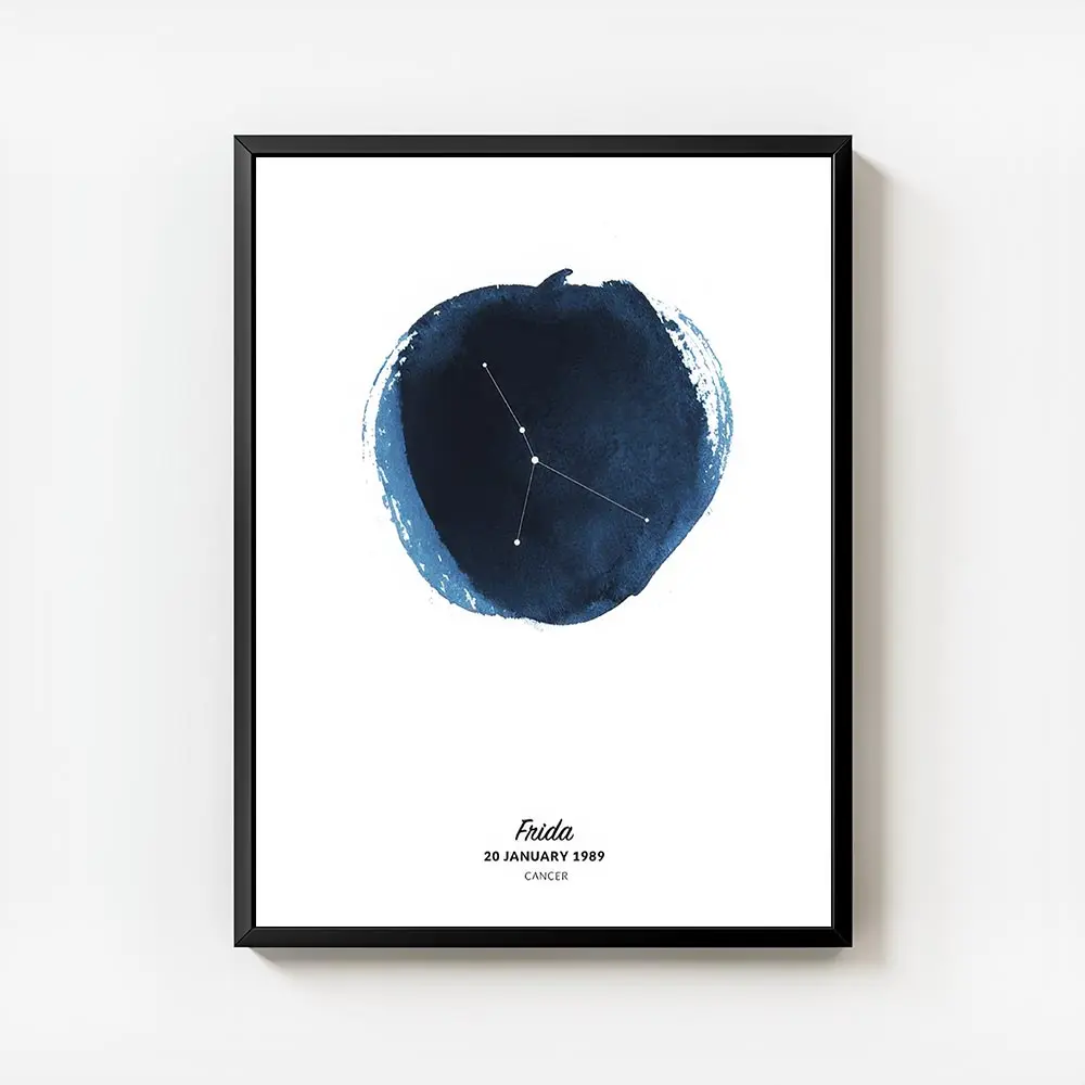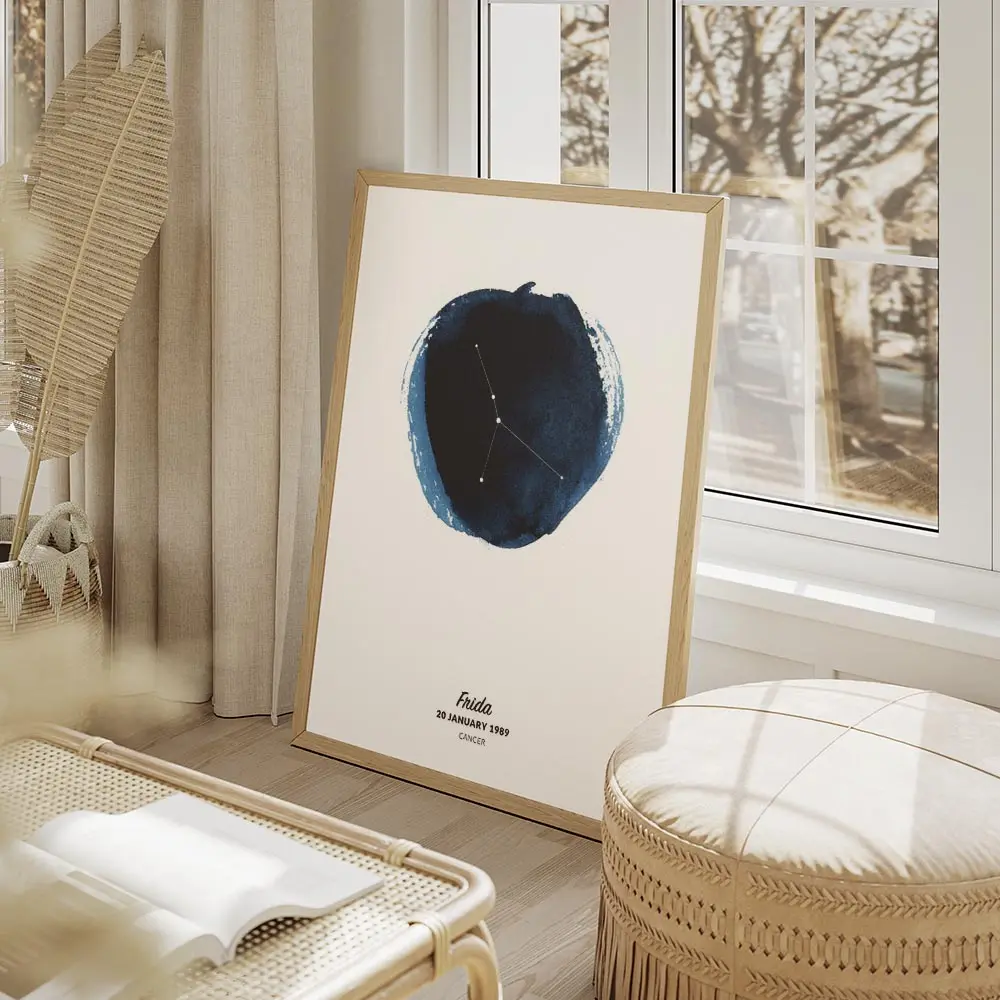 Cette Affiche Cancer texte personnalisé affiche une illustration du signe du Cancer, un crabe dessiné en traits nets, accompagnée d’un texte en typographie personnalisée. Le dessin montre des pinces bien marquées, un corps stylisé et un tracé minimal. On remarque la lisibilité du texte, une composition qui reste épurée, simple et directe.