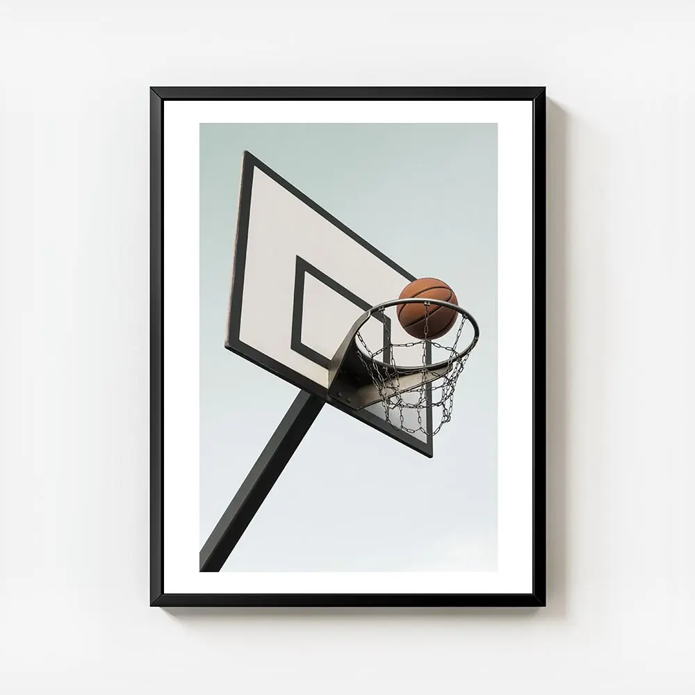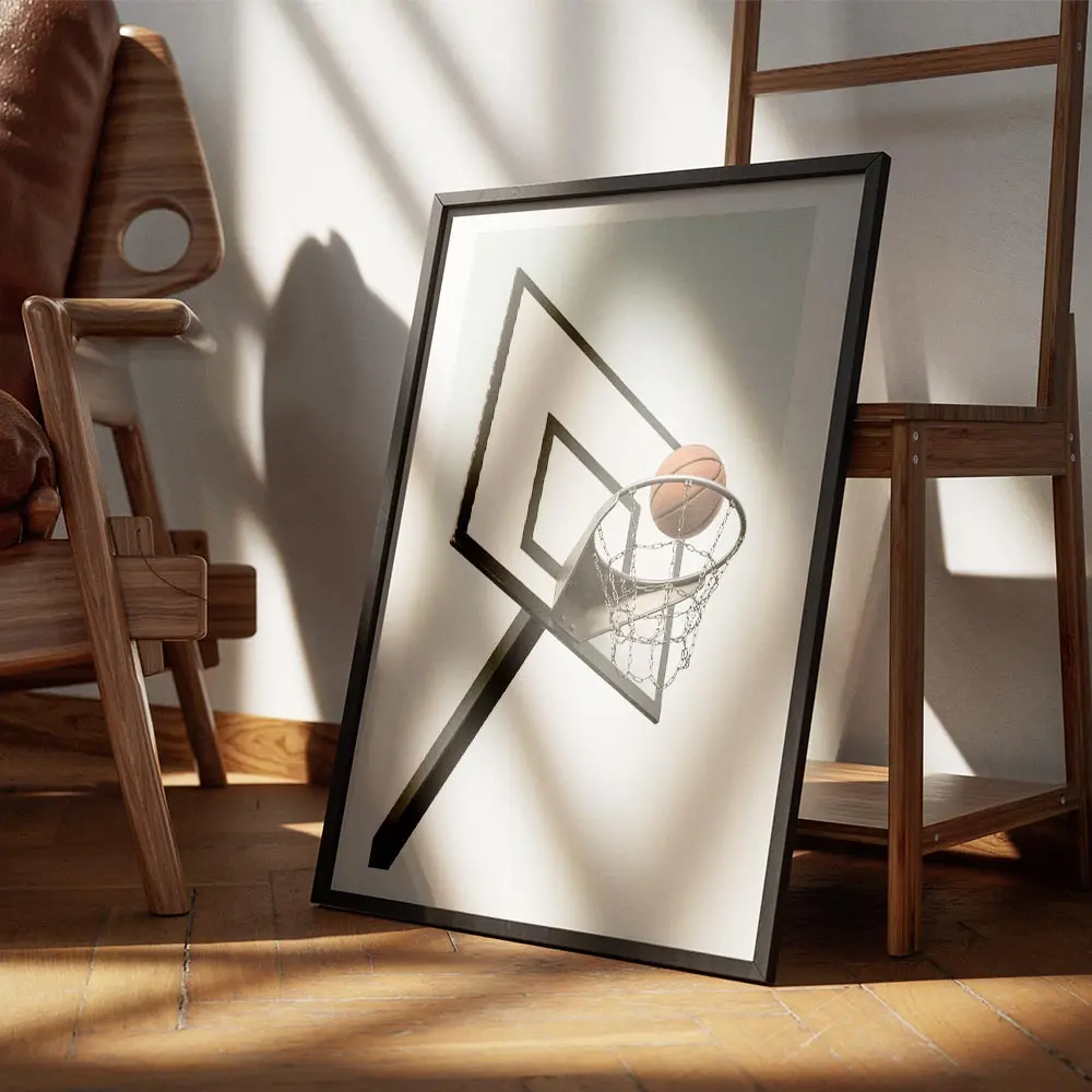 Ce poster Affiche basketball ballon dans le filet montre un gros plan d’un ballon orange coincé dans un filet blanc, sur un fond bleu serein. L’image reste très épurée, presque calme. Le ballon occupe le centre, les mailles du filet dessinent des formes nettes, et le contraste bleu-orange frappe tout de suite.